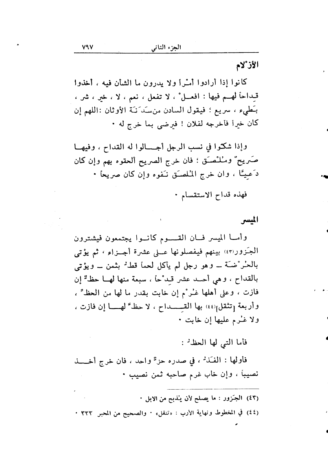وأما الميسر فإن القوم كانوا يجتمعون فيشترون الجزور بينهم فيفصلونها على عشرة أجزاء، ثم يؤتى بالحرضة - وهو رجل لم يأكل لحماً قط بثمن - ويؤتى بالقداح، وهي أحد عشر قدحاً، سبعة منها لها حظ إن فازت، وعلى أهلها غرم إن خابت بقدر ما لها من الحظ، وأربعة [تثقل] بها القداح، لاحظ لها إن فازت، ولا غرم عليها إن خابت.