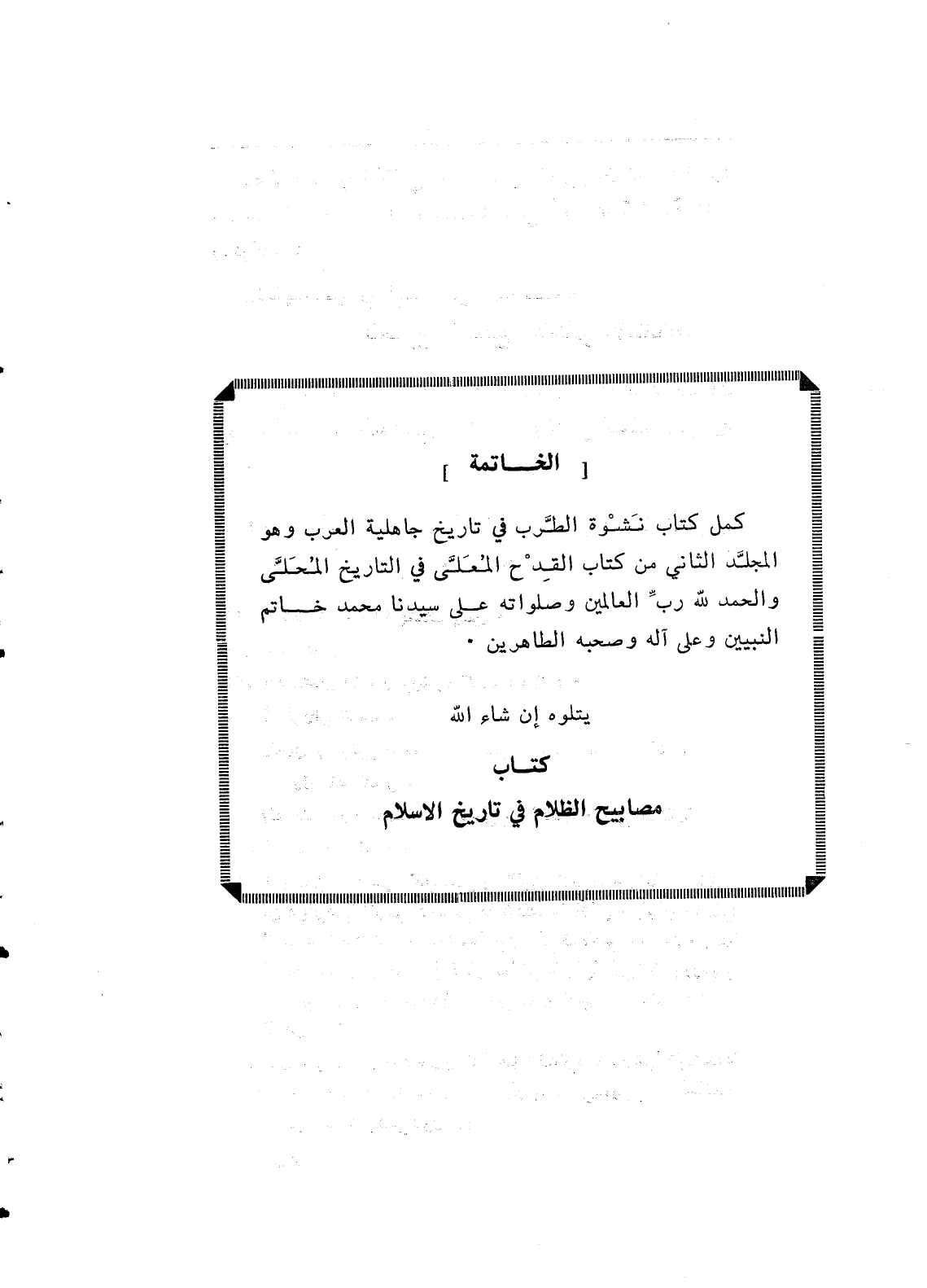 كمل كتاب نشوة الطرب في تاريخ جاهلية العرب وهو المجلد الثاني من كتاب القدح المعلى في التاريخ المحلى والحمد لله رب العالمين وصلواته على سيدنا محمد خاتم النبيين وعلى آله وصحبه الطاهرين.