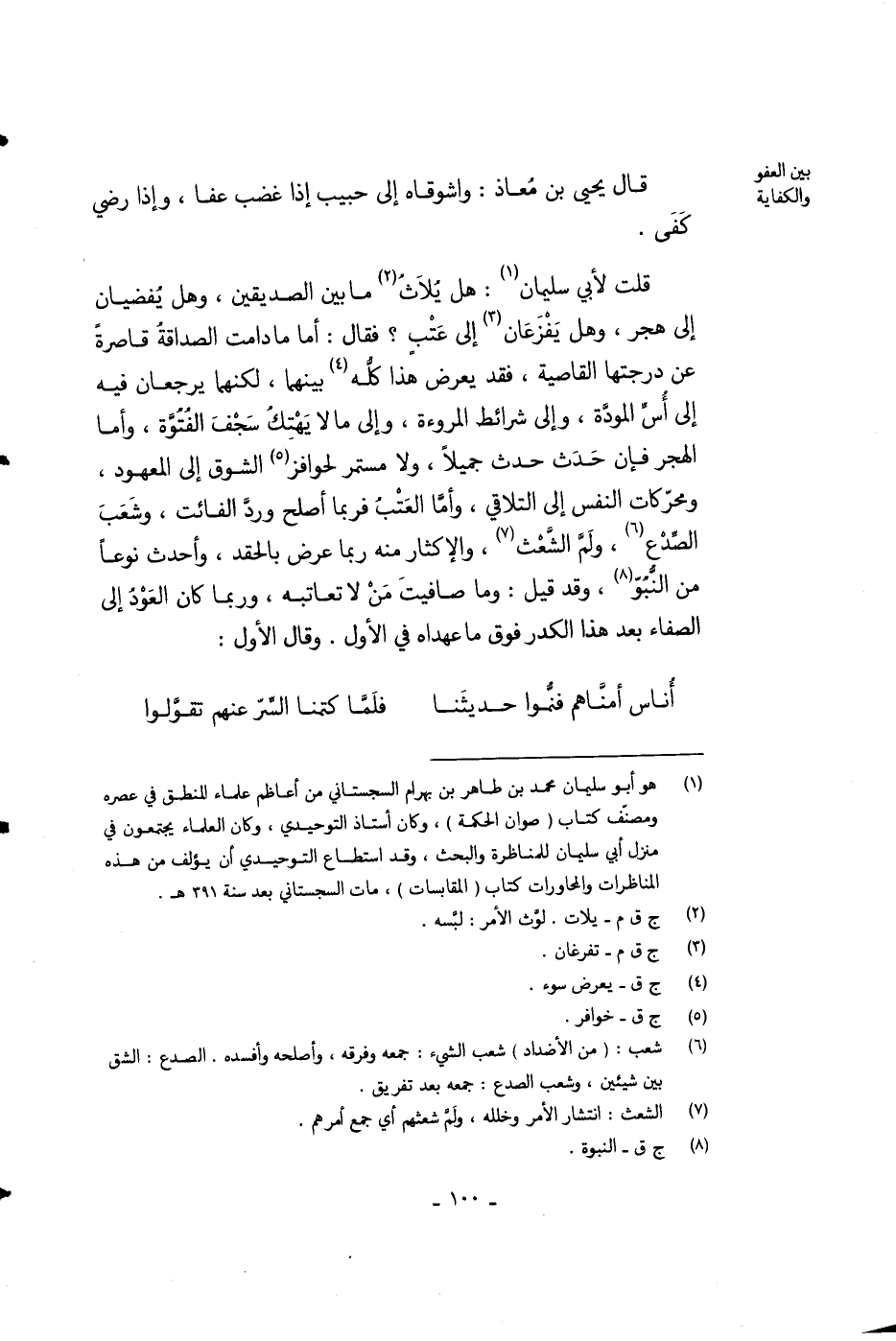 قلت لأبي سليمان: هل يلاث ما بين الصديقين، وهل يفضيان إلى هجر، وهل يفزعان إلى عتب؟ فقال: أما ما دامت الصداقة قاصرة عن درجتها القاصية، فقد يعرض هذا كله بينهما، لكنهما يرجعان فيه إلى أس المودة، وإلى شرائط المروءة، وإلى مالا يهتك سجف الفتوة، وأما الهجر فإن حدث حدث جميلاً، ولا مستمر لحوافز الشوق إلى المعهود، ومحركات النفس إلى التلاقي، وأما العتب فربما أصلح ورد الفائت، وشعب الصدع، ولم الشعث، والإكثار منه ربما عرض بالحقد، وأحدث نوعاً من النبو، وقد قيل: وما صافيت من لا تعاتبه، وربما كان العود إلى الصفاء بعد هذا الكدر فوق ما عهداه في الأول. وقال الأول: