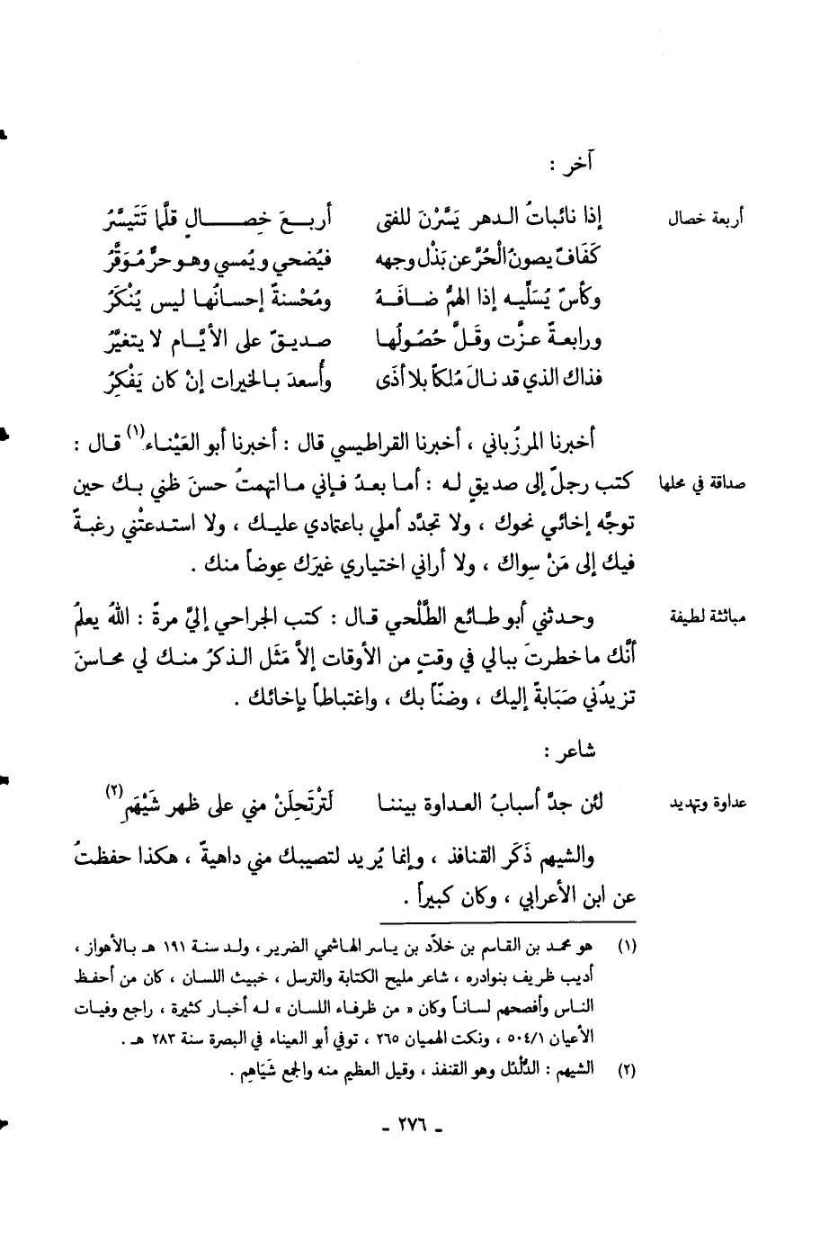 أخبرنا المرزباني، أخبرنا القراطيسي قال: أخبرنا أبو العيناء قال: كتب رجل إلى صديق له: أما بعد فإني ما اتهمت حسن ظني بك حين توجه إخائي نحوك، ولا تجدد أملي باعتمادي عليك، ولا استدعتني رغبة فيك إلى من سواك، ولا أراني اختياري غيرك عوضاً منك.