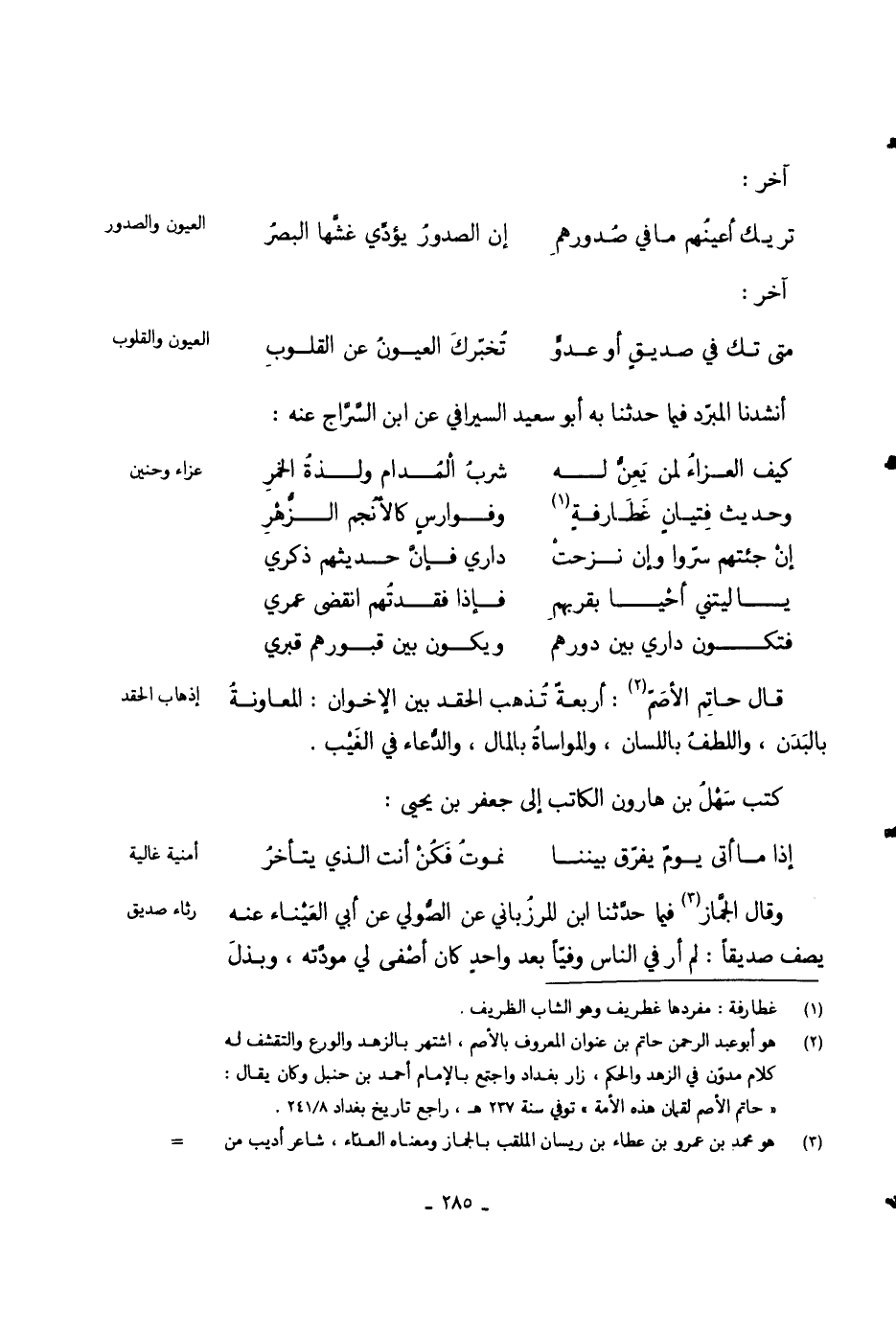 وقال الجماز فيما حدثنا ابن المرزباني عن الصولي عن أبي العيناء عنه يصف صديقاً: لم أر في الناس وفياً بعد واحد كان أصفى لي مودته، وبذل