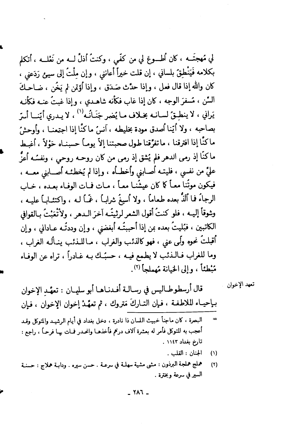 قال أرسطو طاليس في رسالة أفدناها أبو سليمان: تعهد الإخوان بإحياء الملاطفة، فإن التارك متروك، ثم تعهد إخوان الإخوان، فإن