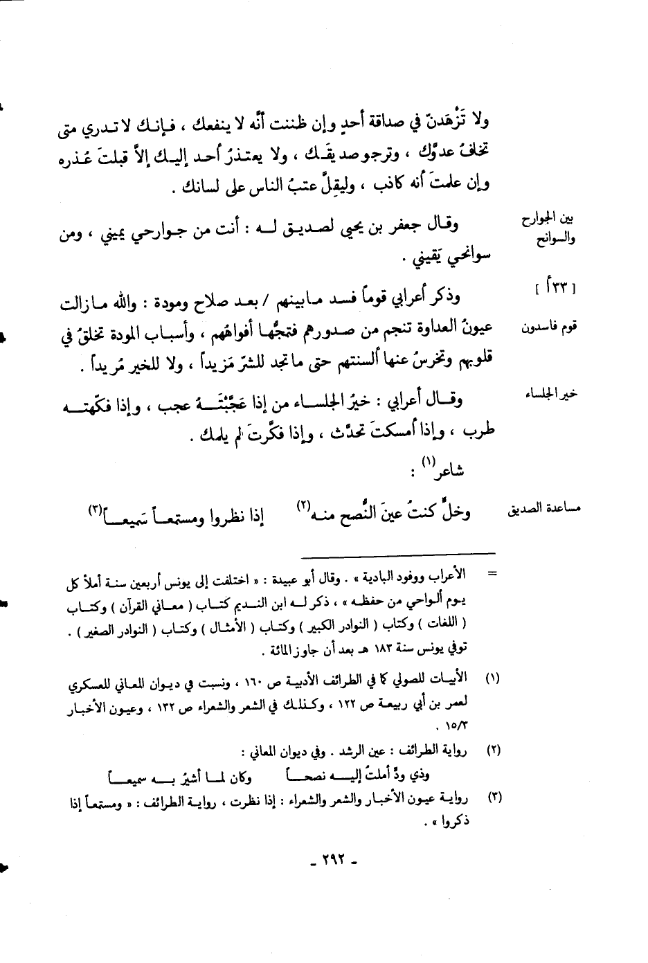 وقال جعفر بن يحيى لصديق له: أنت من جوارحي يميني، ومن سوانحي يقيني.