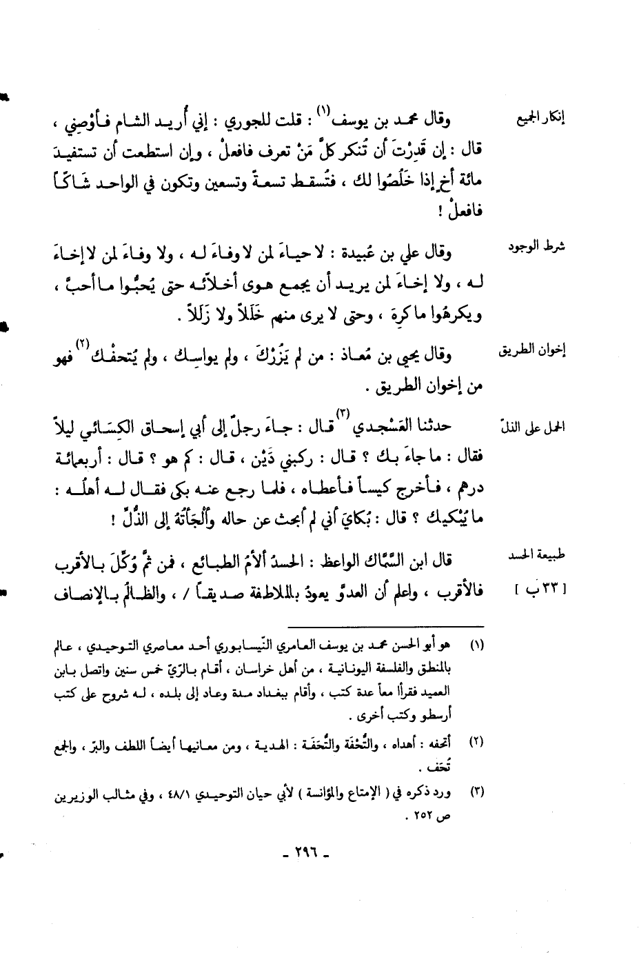 حدثنا العسجدي قال: جاء رجل إلى أبي إسحاق الكسائي ليلاً فقال: ما جاء بك؟ قال: ركبني دين، قال: كم هو؟ قال: أربعمائة درهم، فأخرج كيساً فأعطاه، فلما رجع عنه بكى فقال له أهله: ما يبكيك؟ قال: بكاي أني لم أبحث عن حاله وألجأته إلى الذل! قال ابن السماك الواعظ: الحسد أأم الطبائع، فمن ثم وكل بالأقرب فالأقرب، واعلم أن العدو يعود بالملاطفة صديقاً، والظالم بالإنصاف