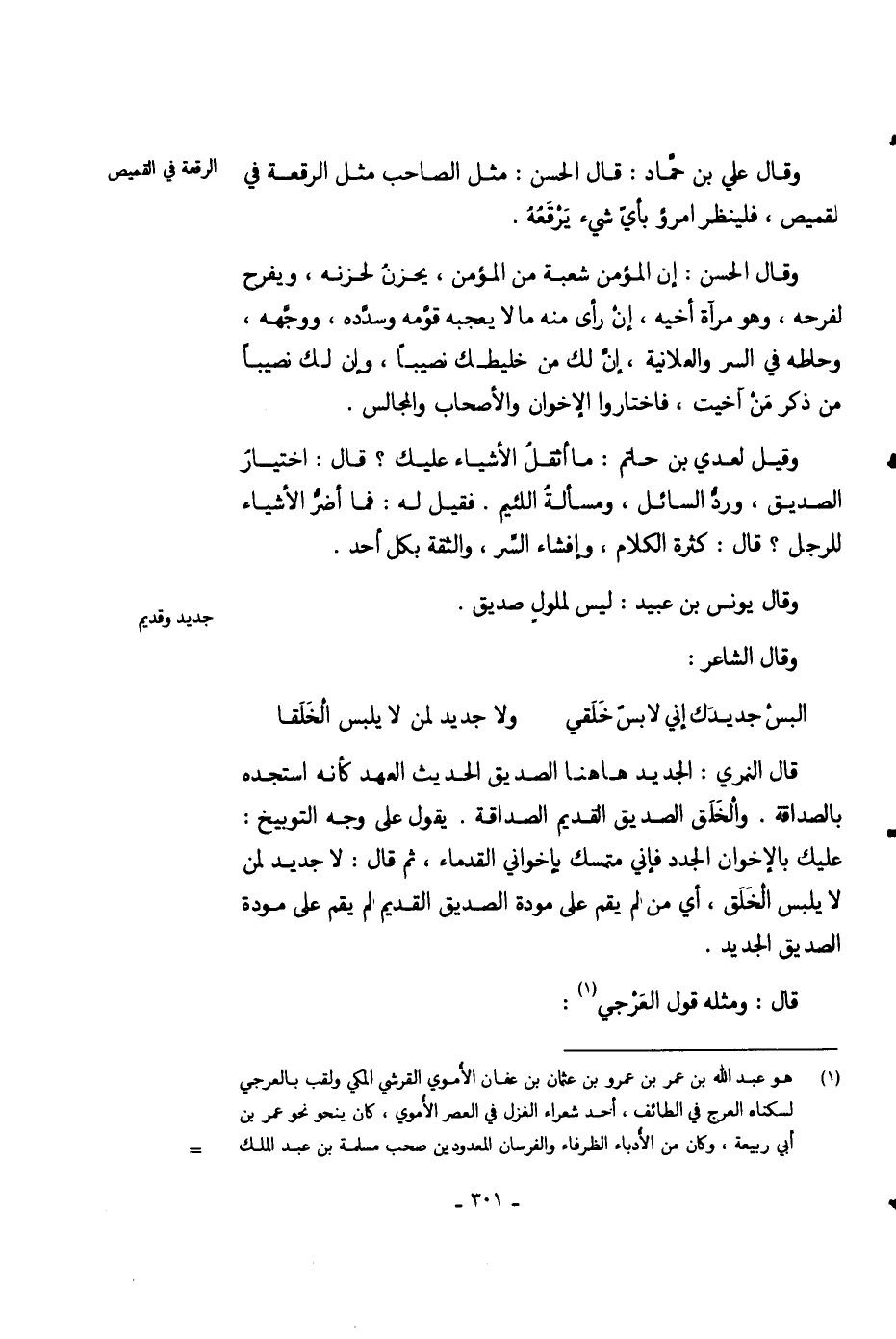 وقال علي بن حماد: قالالحسن: مثل الصاحب مثل الرقعة في لقميص، فينظر امرؤ باي شيء يرقعه.