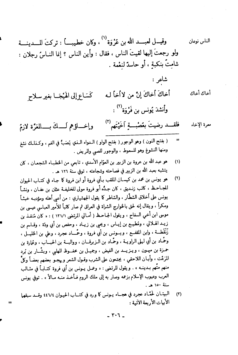 وقيل لعبد الله بن عورة، وكان خطيباً: تركت المدينة ولو رجعت إليها لقيت الناس، فقال: وأين الناس؟ إنما الناس رجلان: شامت بنكبة، أو حاسد لنعمة.