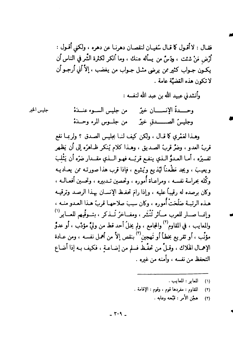 وهذا لعمري كما قال، ولكن كيف لنا بجليس الصدق؟ ولربما نفع قرب العدو، وضر قرب الصديق، وهذا كلام ينكر ظاهره إلى أن يظهر تفسيره، أما العدو الذي ينفع قربه فهو الذي مقدار ضره أن يثلب ويعيب، ويجد مطنعاً ليذيع ويشيع، فإذا قرب هذا صورته ممن يعاديه وكله بحراسة نفسه، ومراعاة أموره، وتحصين تدبيره، وتحسين أفعاله، وكان برصيده له رقيباً عليه، وإذا رام تحفظ الإنسان بهذا الرصد وترقيه هذه الرتبة صلحت أموره، وكان سبب صلاحها قرب هذا العدو منه، وإنما صار للعرب مآثر تنشر، ومفاخر تذكر، بتوقيهم المعاير والمعايب، في المقاوم والمجامع، ولم يخل أحد قط من ولي مؤدب، أو عدو مؤنب، أو تقريع بخطأ أو تهجين بنقص إلا من أهمل نفسه، ومن عادة الإهمال الهلاك، وقل من تحفظ فسلم من غضاعة، فكيف به إذا أضاع التحفظ من نفسه، وأمنه من غيره.