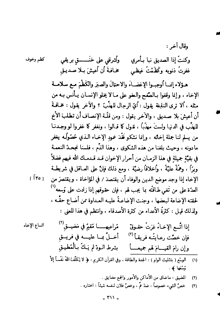 هؤلاء إنما أوجبوا الإغضاء والاحتمال والصبر والكظم مع سلامة الإخاء، وإنما وقفوا بالصفح والعفو على ما يخلو الإنسان يأنس به من مثله، ألا ترى النابغة يقول: أي الرجال المهذب؟ والآخر يقول: مخافة أن أعيش بلا صديق، والآخر يقول: ومن قلة الإنصاف أن تطلب الأخ المهذب في الدنيا ولست مهذباً، نقول كما قالوا، ونغفر كما غفروا لو وجدنا من يسلم لنا جملة إخائه، وإنما نشكو فقد عمود الإخاء الذي حصوله يغفر ما دونه، وحيث بلغنا من هذه الشكوى، وهذا الذم، فلسنا نجحد النعمة في بقية جميلة في هذا الزمان من أحرار الإخوان قد قدمك الله فيهم فضلاً وبراً، وهمة عليه، وأخلاقاً رضية، ومع ذلك فإن على العاقل في شريطة الإخاء إذا وجد موضع الدين والوفاء أن يقتصد في المؤاخاة، ويتقصر من العدة على من تفي طاقته بما يجب لهم، فإن حقوقهم إذا زادت على وسعه لحقته الإضاعة لبعضها، وجنت الإضاعة عليه العداوة ممن أضاع حقه، ولذلك قيل: كثرة الأعداء من كثرة الأصدقاء، وانتظم في هذا المعنى: