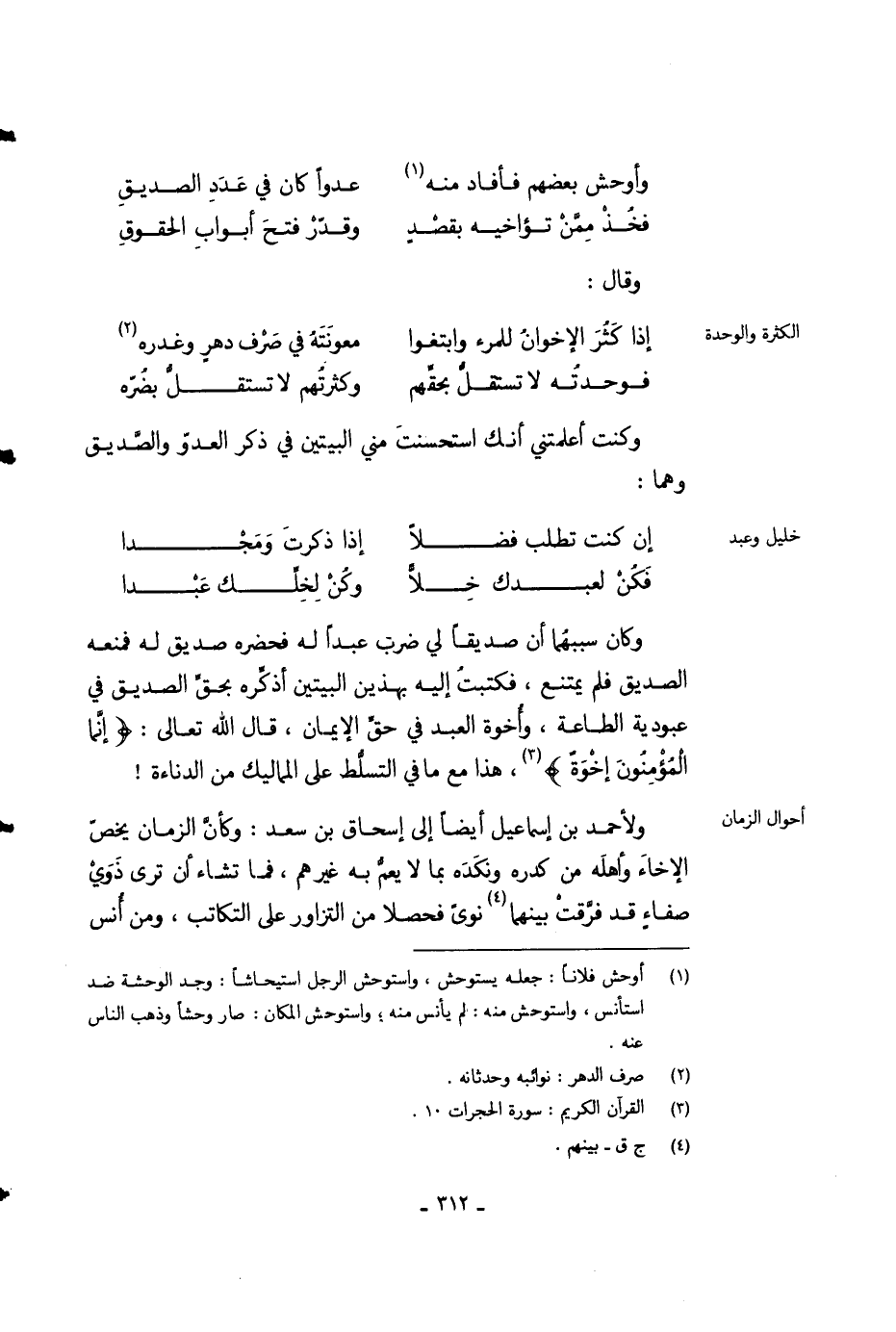ولأحمد بن إسماعيل أيضاً إلى إسحاق بن سعد: وكأن الزمان يخص الإخاء وأهله من كدره ونكده بما لا يعم به غيهم، فما تشاء أن ترى ذوي صفاء قد فرقت بينهما نوى فحصلا من التزاور على التكاتب، ومن أنس