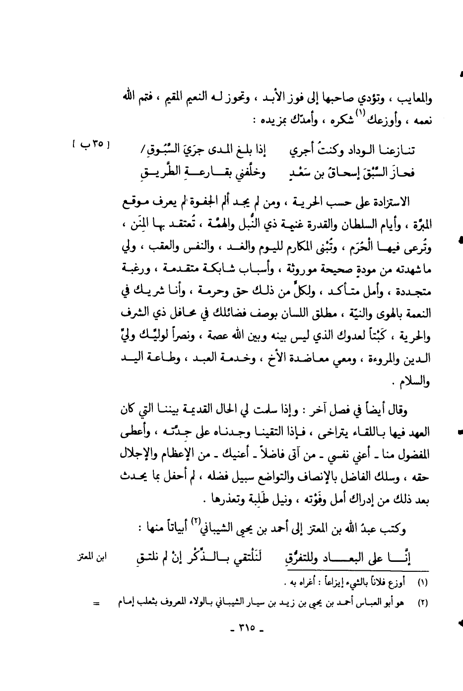 الاستزادة على حسب الحرية، ومن لم يجد ألم الجفوة لم يعرف موقع المبرة، وأيام السلطان والقدرة غنيمة ذي النبل والهمة، تعتقد بها المنن، وترعى فيها الحرم، وتبنى المكارم لليوم والغد، والنفس والعقب، ولي ما شهدته من مودة صحيحة موروثة، وأسباب شابكة متقدمة، وربغة متجددة، وأمل متأكد، ولكل من ذلك حق وحرمة، وأنا شريك في النعمة بالهوى والنية، مطلق اللسان بوصف فضائلك في محافل ذي الشرف والحرية، كبتاً لعدوك الذي ليس بينه وبين الله عصمة، ونصراً لوليك ولي الدين والمروءة، ومعي معاضدة الأخ، وخدمة العبد، وطاعة اليد والسلام.