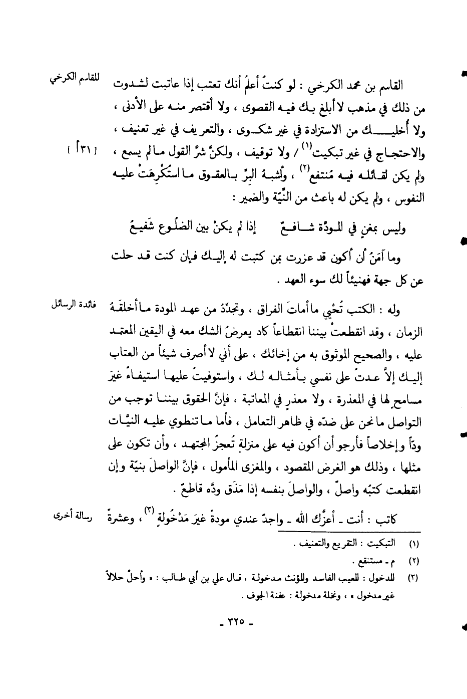 القاسم بن محمد الكرخي: لو كنت أعلم أنك تعتب إذا عاتبت لشدوت من ذلك في مذهب لا أبلغ بك فيه القصوى، ولا أقتصر منه على الأدنى، ولا أخليك من الاستزاده في غير شكوى، والتعريف في غير تعنيف، والاحتجاج في غير تبكيت ولا توقيف، ولكن شر القول ما لم يسمع، ولم يكن لقائله فيه منتفع، وأشبه البر بالعقوق ما استكرهت عليه النفوس، ولم يكن له باعث من النية والضمير: