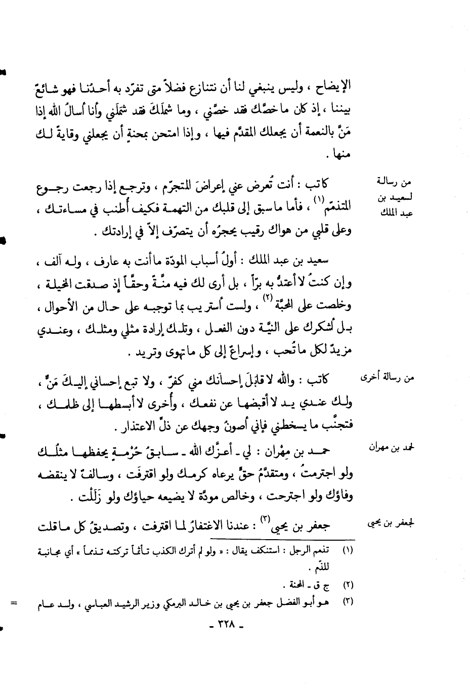 سعيد بن عبد الملك: أول أسباب المودة ما أنت به عارف، وله آلف، وإن كنت لا أعتد به براً، بل أرى لك فيه منة وحقاً إذ صدقت المخيلة، وخلصت على المحبة، ولست أستريب بما توجبه على حال من الأحوال، بل أشكرك على النية دون الفعل، وتلك إرادة مثلي ومثلك، وعندي مزيد لكل ما تحب، وإسراع إلى كل ما تهوى وتريد.