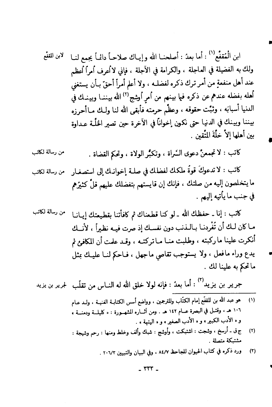 ابن المقفع: أما بعد: أصلحنا الله وإياك صلاحاً دائماً يجمع لنا ولك به الفضيلة في العاجلة، والكرامة في الآجلة، فإني لا أعرف أمراً أعظم عند أهل منفعة من أمر ترك ذكره لفضله، ولا أعلم أمراً أحق بأن يستغنى أهله بفضله عندهم عن ذكره فيما بينهم من أمر أوشج الله بيننا وبينك في الدنيا أسبابه، وثبت حقوقه، وعظم حرمته فأبقى الله لنا ولك ما أحرزه بيننا وبينك في الدنيا حتى نكون إخواناً في الآخرة حين تصير الخلة عداوة بين أهلها إلا خلة المتقين.