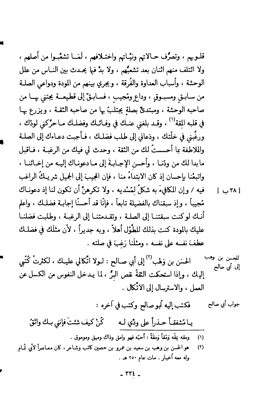 قلوبهم، وتصرف حالاتهم ونياتهم واختلافهم، لما تشعبوا من أصلهم، ولا ائتلف منهم اثنان بعد تشعبهم، ولا بد فيما يحدث بين الناس من علل الوحشة، وأسباب العداوة والفرقة، ويجري بينهم من المودة ودواعي الصلة من سابق ومسبوق، وداع ومجيب، فسابق إلى قطيعة يجتني بها من صاحبه الوحشة، ومبتدئ بصلة يجتلب بها من صاحبه الثقة، ويزرع بها في قلبه المقة، وقد بلغني عنك في وفائك وفضلك ما حركني لودك، ورغبتي في خلتك، ودعاني إلى طلب فضلك، فأجبت دعاءك إلى الصلة والملاطفة بما أحسست لك من الثقة، وحدث لي فيك من الرغبى، فاقبل ما بدا لك من ودنا، وأحسن الإجابة إلى ما دعوناك إليه من إخائنا، واتبعنا بإحاسن إذ كان الابتداء منا، فإن المجيب إلى الجميل شريك الراغب فيه وإن المكافئ به شكل لمسديه، ولا تركهن أن تكون لنا إذ دعوناك مجيباً، وإذ سبقناك بالفضيلة تابعاً، فأنا قد أحسنا إجابة فضلك، واعلم أنك لو كنت سبقتنا إلى الصلة، وتقدمتنا إلى الرغبة، وطلبت فضلنا عليك بالمودة كنت بذلك للطول أهلاً، وبه جديراً، لأن مثلك في فذلك عطف نفسه على نفسه، ومثلنا رغب في صلته.