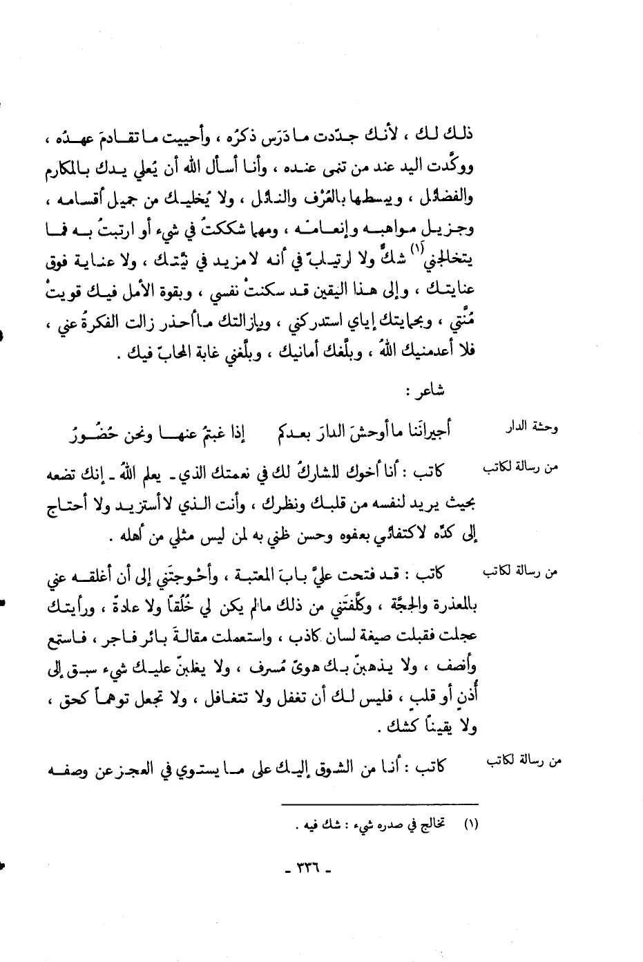 ذلك لك، لأنك جددت ما درس ذكره، وأحييت ما تقادم عهده، ووكدت اليد عند من تنمى عنده، وأنا أسأل الله أن يعلي يدك بالمكارم والفضائل، ويبسطها بالعرف والنائل، ولا يخليك من جميل أقسامه، وجزيل مواهبه وإنعامه، ومهما شككت في شيء أو ارتبت به فما يتخالجني شك ولا ارتياب في أنه لا مزيد في نيتك، ولا عناية فوق عنايتك، وإلى هذا اليقين قد سكنت نفسي، وبقوة الأمل فيك قويت منتي، وبحمايتك إياي استدركني، وبإزالتك ما أحذر زالت الفكرة عني، فلا أعدمنيك الله، وبلغك أمانيك، وبلغني غابة المحاب فيك.