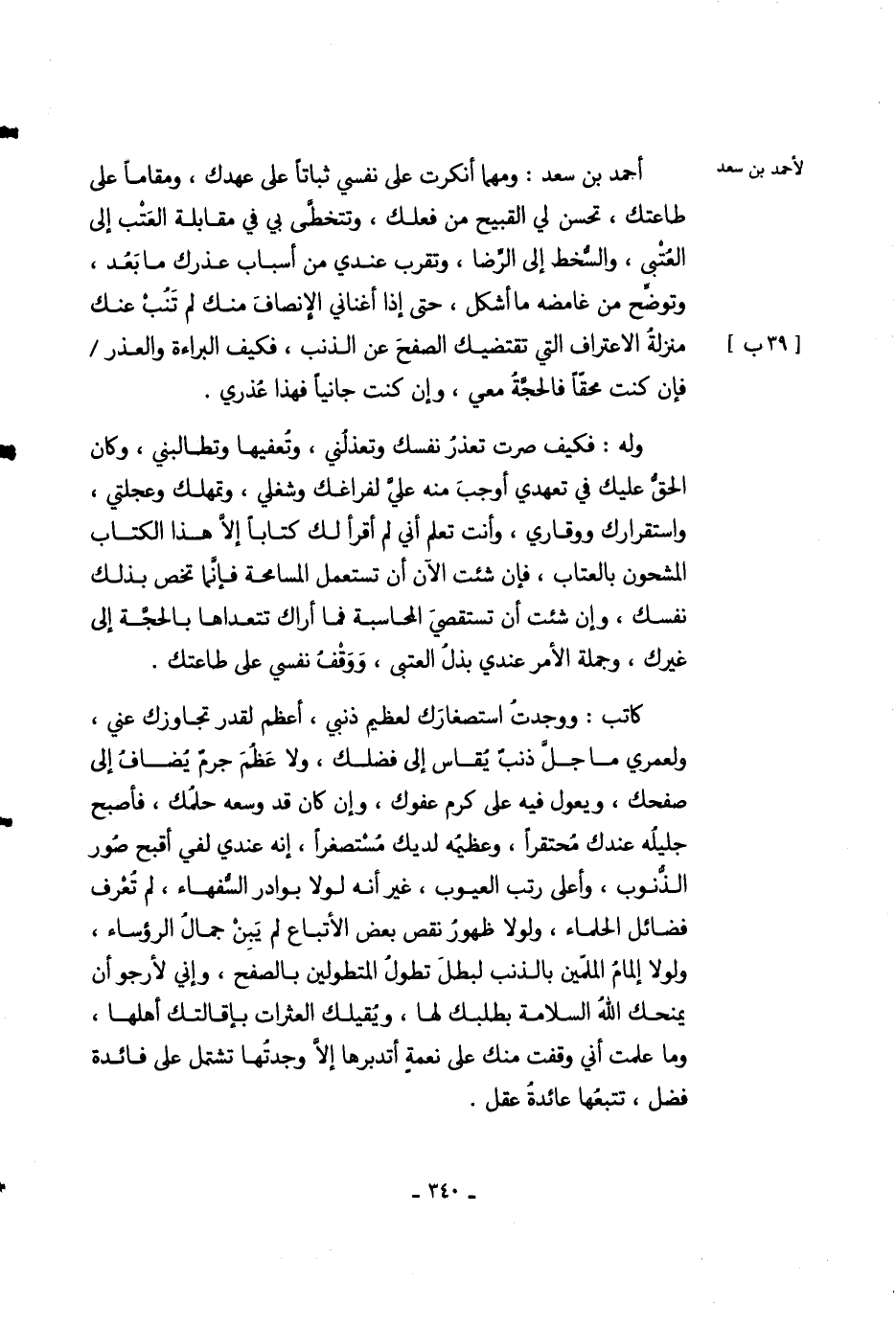 أحمد بن سعد: ومهما أنكرت على نفسي ثباتاً على عهدك، ومقاماً على طاعتك، تحسن لي القبيح من فعلك، وتتخطى بي في مقابلة العتب إلى العتبي، والسخط إلى الرضا، وتقرب عندي من أسباب عذرك ما بعد، وتوضح من غامضه ما أشكل، حتى إذا أغناني الإنصاف منك لم تنب عنك منزلة الاعتراف التي تقتضيك الصفح عن الذنب، فكيف البراءة والعذر فإن كنت محقاً فالحجة معي، وإن كنت جانباً فهذا عذري.