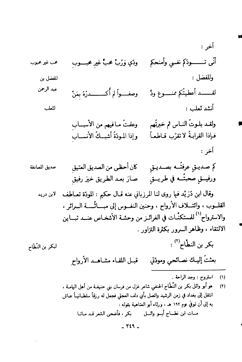وقال ابن دريد فيما روى لنا المرزباني عنه قال حكيم: المودة تعاطف القلوب، وائتلاف الأرواح، وحنين النفوس إلى مباثة السرائر، والاسترواح للمستكنات في الغرائز من وحشة الأشخاص عند تباين الالتقاء، وظاهر السرو بكثرة التزاور.