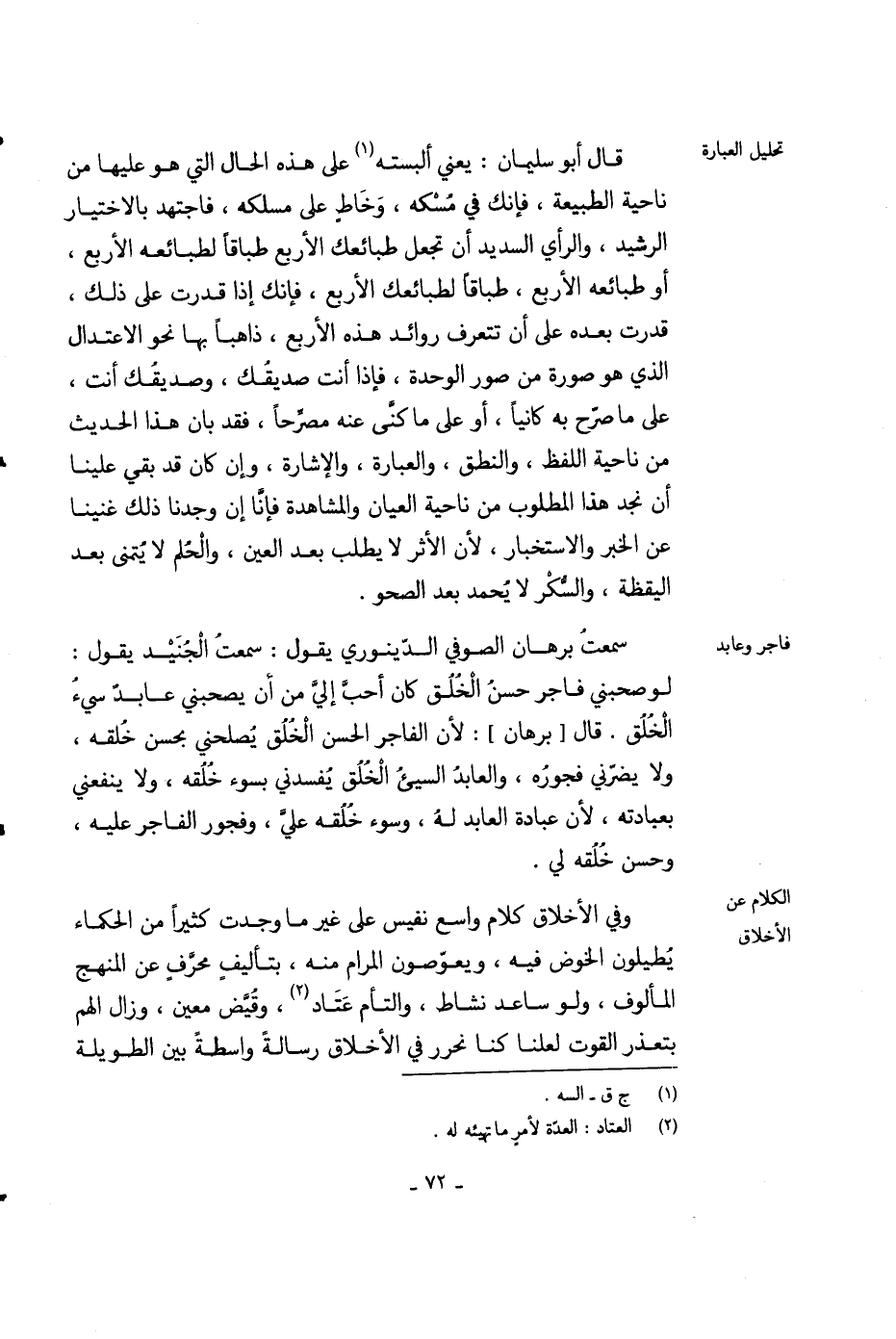وفي الأخلاق كلام واسع نفيس على غير ما وجدت كثيراً من الحكماء يطيلون الخوض فيه، ويعوصون المرام منه، بتأليف محرف عن المنهج المألوف، ولو ساعد نشاط، والتأم عتاد، وقيض معين، وزال الهم بتعذر القوت لعلنا كنا نحرر في الأخلاق رسالة واسطة بين الطويلة