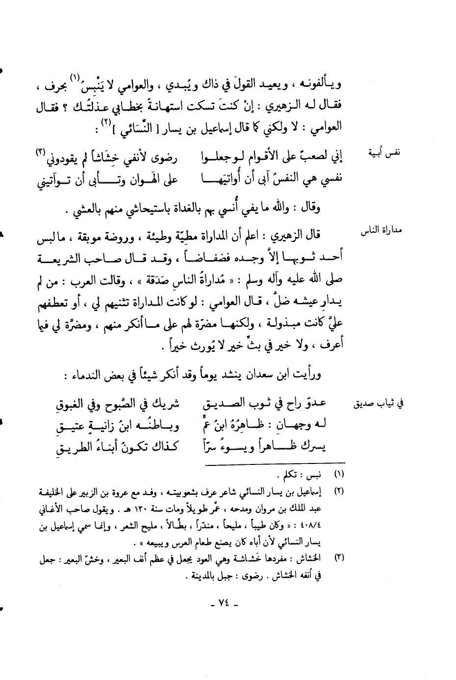 قال الزهيري: اعلم أن النداراة مطية وطيئة، وروضة موبقة، ما لبس أحد ثوبها إلا وجده فضفاضاً، وقد قال صاحب الشريعة صلى الله عليه وآله وسلم: مداراة الناس صدقة، وقالت العرب: من لم يدار عيشه ضل، قال العوامي: لو كانت المداراة تثنيهم لي، أو تعطفهم علي كانت مبذولة، ولكنها مضرة لهم على ما أنكر منهم، ومضرة لي فيما أعرف، ولا خير في بث خير لا يورث خيراً.