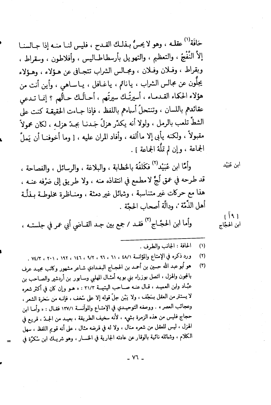 حافة عقله، وهو لا يحس بذلك القدح، فليس لنا منه إذا جالسنا إلا النفج، والتعظيم، والتهويل بأرسطاطاليس، وأفلاطون، وسقراط، وبقراط، وفلان وفلان، ومجالس الشراب تتجافى عن هؤلاء، وهؤلاء يجلون عن مجالس الشراب، يا نائم، يا غافل، يا ساهي، وأين أنت من هؤلاء الحكماء القدماء، أسيرتك سيرتهم، أحالك حالهم؟ إنما تدعي عقائدهم باللسان، وتنتحل أسماءهم باللفظ، فإذا جاءت الحقيقة كنت على الشط تلعب بالرمل، ولولا أنه يكدر هزل جدنا بجد هزله، لكان محمولاً مقبولاً، ولكنه يأبى إلا ما ألفه، وأفاد المران عليه، وما أخوفنا أن يمل الجماعة، وإن لم تمله الجماعة.