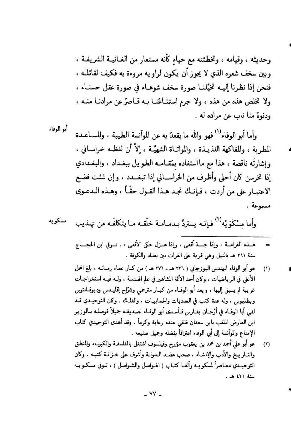 وأما أبو الوفاء فهو والله ما يقعد به عن الموآنسة الطيبة، والمساعدة المطربة، والمفاكهة اللذيذة، والمواتاة الشهية، إلا أن لفظه خراساني، وإشارته ناقصة، هذا مع استفاده بمقامه الطويل ببغداد، والبغدادي إذا تخرسن كان أحلى وأظرف من الخراساني إذا تبغدد، وإن شئت فضع الاعتبار على من أردت، فإنك تجد هذا القول حقاً، وهذه الدعوى مسموعة.