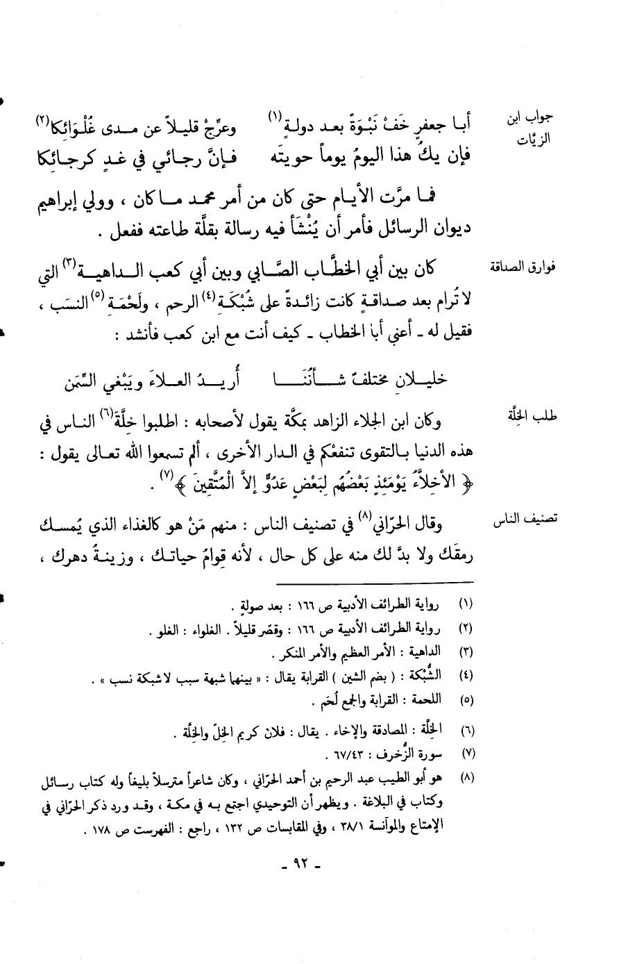 وقال الحراني في تصنيف الناس: منهم من هو كالغذاء الذي يمسك رمقك ولابد لك منه على كل حال، لأنه قوام حياتك، وزينة دهرك،