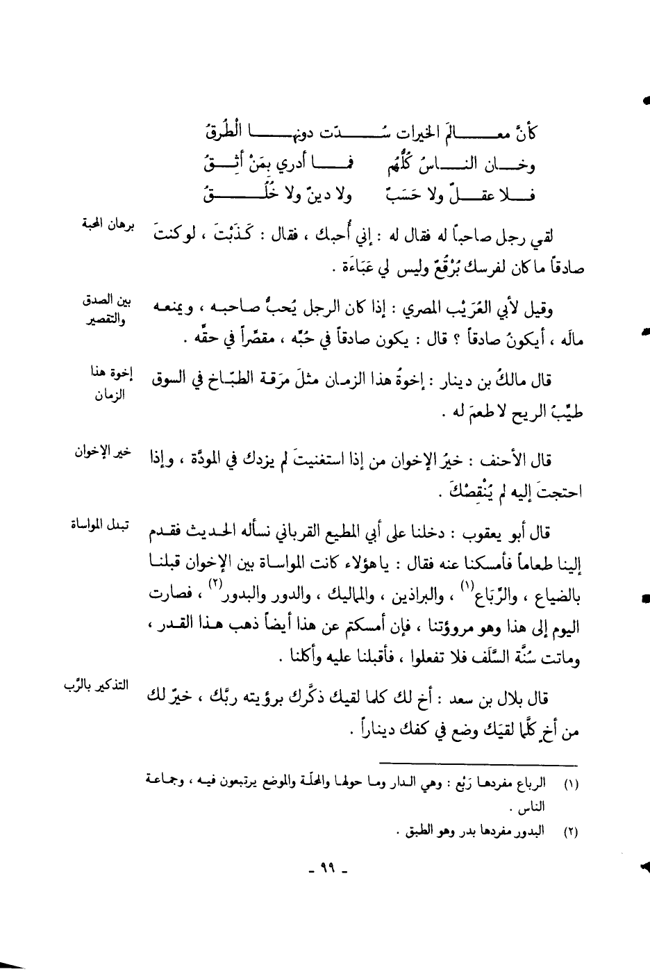 وقيل لأبي العريب المصري: إذا كان الرجل يحب صاحبه، ويمنعه ماله، أيكون صادقاً؟ قال: يكون صادقاً في حبه، مقصراً في حقه.