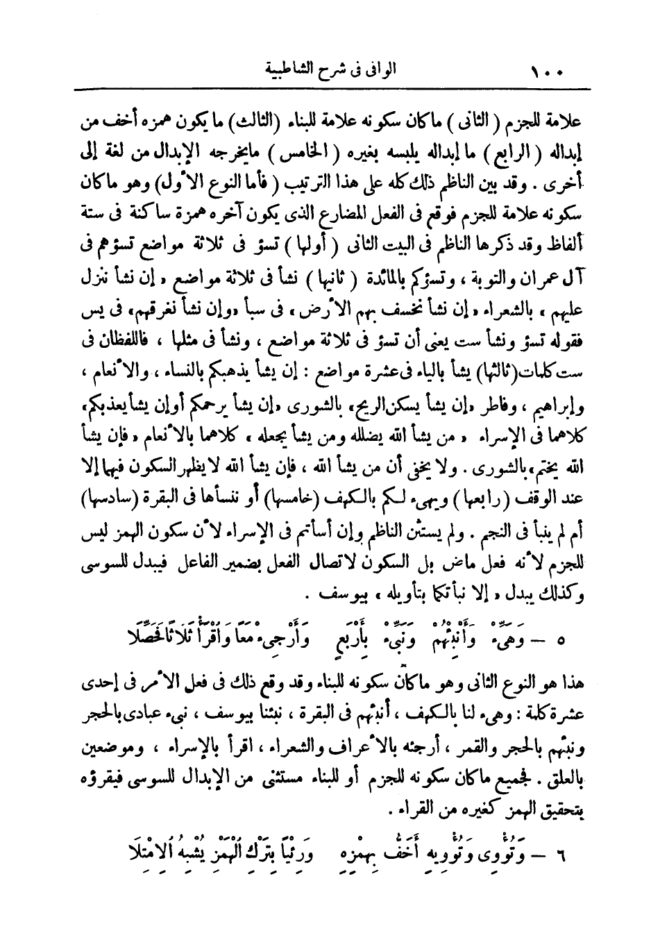 المعنى: هذا هو النوع الثاني وهو ما كان سكونه للبناء، وقد وقع ذلك في فعل الأمر في إحدى عشرة كلمة: وَهَيِّئْ لَنا بالكهف، أَنْبِئْهُمْ في البقرة، نَبِّئْنا بيوسف، نَبِّئْ عِبادِي بالحجر، وَنَبِّئْهُمْ* بالحجر والقمر، أَرْجِهْ* بالأعراف والشعراء، اقْرَأْ* بالإسراء، وموضعين بالعلق. فجميع ما كان سكونه للجزم أو للبناء مستثنى من الإبدال للسوسي فيقرؤه بتحقيق الهمز كغيره من القراء.