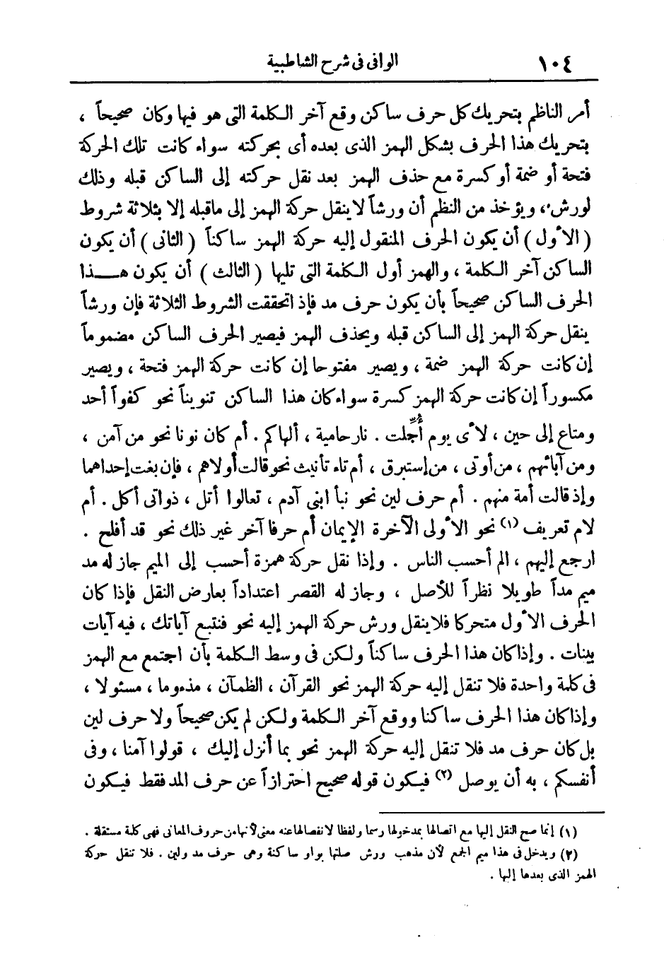 الثالث: أن يكون هذا الحرف الساكن صحيحا بأن يكون حرف مد. فإذا تحققت الشروط الثلاثة؛ فإن ورشا ينقل حركة الهمز إلى الساكن قبله ويحذف الهمز فيصير الحرف الساكن مضموما إن كانت حركة الهمز ضمة، ويصير مفتوحا إن كانت حركة الهمز فتحة، ويصير مكسورا إن كانت حركة الهمزة كسرة سواء كان هذا الساكن تنوينا نحو: كُفُواً أَحَدٌ، وَمَتاعٌ إِلى حِينٍ*، لِأَيِّ يَوْمٍ أُجِّلَتْ، نارٌ حامِيَةٌ، أَلْهاكُمُ. أم كان نونا نحو مَنْ آمَنَ*، وَمِنْ آبائِهِمْ، مَنْ أُوتِيَ*، مِنْ إِسْتَبْرَقٍ، أم تاء تأنيث نحو وَقالَتْ أُولاهُمْ، فَإِنْ بَغَتْ إِحْداهُما وَإِذْ قالَتْ أُمَّةٌ مِنْهُمْ أم حرف لين نحو نَبَأَ ابْنَيْ آدَمَ، تَعالَوْا أَتْلُ ذَواتَيْ أُكُلٍ. أم لام تعريف (¬1) نحو الْأُولى وَالْآخِرَةِ الْأَيْمانَ* أم حرفا آخر غير ذلك نحو قَدْ أَفْلَحَ*. ارْجِعْ إِلَيْهِمْ، الم (1) أَحَسِبَ النَّاسُ. وإذا نقل حركة همزة أَحَسِبَ إلى الميم جاز له مد الميم مدّا طويلا نظرا للأصل، وجاز له القصر اعتدادا بعارض النقل فإذا كان الحرف الأول متحركا فلا ينقل ورش حركة الهمز إليه نحو فَنَتَّبِعَ آياتِكَ*، فِيهِ آياتٌ بَيِّناتٌ. وإذا كان هذا الحرف ساكنا ولكن في وسط الكلمة بأن اجتمع مع الهمز في كلمة واحدة فلا تنقل إليه حركة الهمز نحو الْقُرْآنِ*، الظَّمْآنُ، مَذْؤُماً، مَسْؤُلًا*، وإذا كان هذا الحرف ساكنا ووقع آخر الكلمة ولكن لم يكن صحيحا ولا حرف لين بل كان حرف مد فلا تنقل إليه حركة الهمز نحو بِما أُنْزِلَ إِلَيْكَ*،