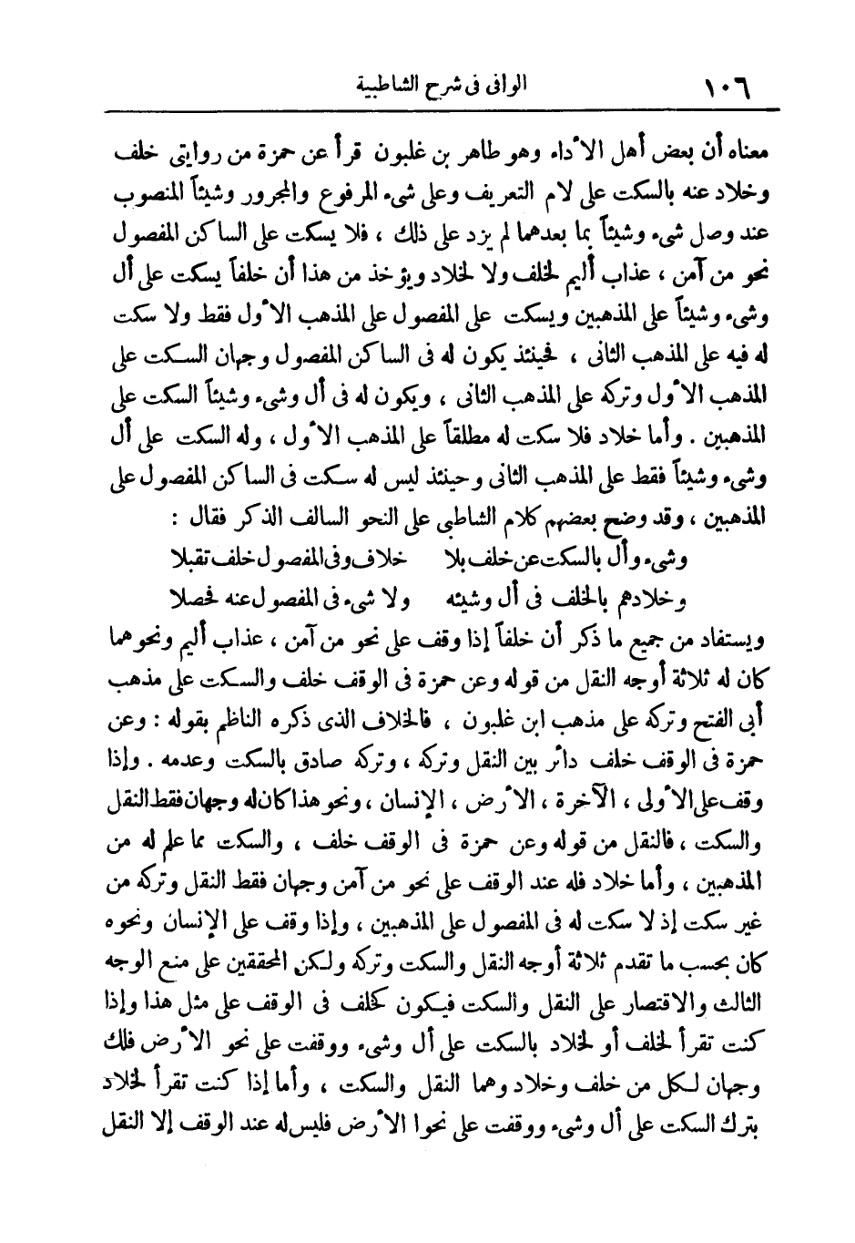 وأما خلاد فله عند الوقف على نحو مَنْ آمَنَ* وجهان فقط: النقل، وتركه من غير سكت؛ إذ لا سكت له في المفصول على المذهبين. وإذا وقف على الْإِنْسانُ* ونحوه: كان بحسب ما تقدم ثلاثة أوجه: النقل، والسكت، وتركه، ولكن المحققين على منع الوجه الثالث والاقتصار على النقل والسكت فيكون كخلف في الوقف على مثل هذا وإذا كنت تقرأ لخلف أو لخلاد بالسكت على أل وشَيْءٍ* ووقفت على نحو الْأَرْضِ*: فلك وجهان لكل من خلف وخلاد وهما: النقل والسكت، وأما إذا كنت تقرأ لخلاد بترك السكت على أل وشَيْءٍ* ووقفت على نحو الْأَرْضِ*: فليس له عند الوقف إلا النقل،