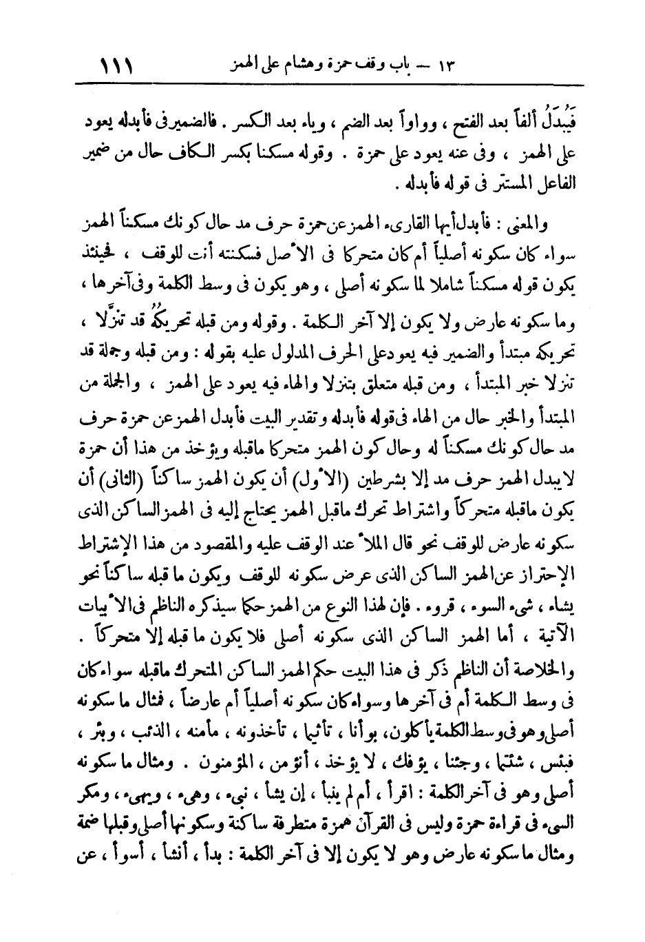 والمعنى: فأبدل أيها القارئ الهمز عن حمزة حرف مدّ حال كونك مسكنا الهمز سواء كان سكونه أصليّا، أم كان متحركا في الأصل فسكنته أنت للوقف، فحينئذ يكون قوله (مسكنا) شاملا لما سكونه أصلي، وهو يكون في وسط الكلمة وفي آخرها، وما سكونه عارض ولا يكون إلا آخر الكلمة. وقوله (ومن قبله تحريكه قد تنزّلا)، (تحريكه) مبتدأ والضمير فيه يعود على الحرف المدلول عليه بقوله: (ومن قبله) وجملة (قد تنزلا) خبر المبتدأ، (ومن قبله) متعلق (بتنزلا) والهاء فيه يعود على الهمز، والجملة من المبتدأ والخبر حال من الهاء في قوله (فأبدله)، وتقدير البيت: فأبدل الهمز عن حمزة حرف مدّ حال كونك مسكنا له، وحال كون الهمز متحركا ما قبله، ويؤخذ من هذا: أن حمزة لا يبدل الهمز حرف مدّ إلا بشرطين: