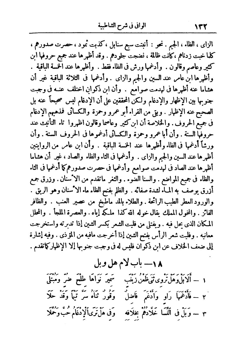 والخلاصة: أن ابن كثير وعاصما وقالون اظهروا تاء التأنيث عند حروفها الستة. وأن أبا عمرو وحمزة والكسائي أدغموها في الحروف الستة. وأن ورشا أدغمها في الظاء، وأظهرها عند الخمسة الباقية. وأن ابن عامر من الروايتين أظهرها عند السين والجيم والزاى. وأدغمها في الثاء والظاء والصاد، غير أن هشاما أظهرها عند الصاد في لَهُدِّمَتْ صَوامِعُ وأدغمها في حَصِرَتْ صُدُورُهُمْ كما أدغمها في الثاء والظاء في جميع المواضع. و (السنا) الضوء. و (الثغر) ما تقدم من الأسنان. و (زرق) جمع أزرق يوصف به الماء لشدة صفائه. و (الظلم) بفتح الظاء ماء الأسنان وهو الريق، و (الورود) العطر الطيب الرائحة. و (الطلاء) بالمد ما طبخ من عصير العنب. و (الظافر) الفائز. و (المخول) المملك يقال: خوله الله كذا: ملكه إياه. و (العصرة) الملجأ. و (المحلل) المكان الذي يحل فيه. و (يفتلى) من فليت الشعر بكسر الشين: إذا تدبرته واستخرجت معانيه. وفليت شعر الرأس بفتح الشين: إذا أخرجت ما فيه من المؤذي. وفيه إشارة إلى ضعف الخلاف عن ابن ذكوان فليس له في وَجَبَتْ جُنُوبُها إلا الإظهار كما تقدم.