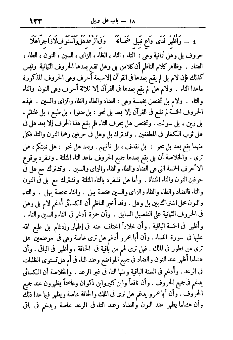 والخلاصة: أن بل يقع بعدها جميع الحروف ما عدا الثاء المثلثة، وتنفرد بوقوع الأحرف الخمسة التى هي: الضاد، والطاء، والظاء، والزاى، والسين، وتشترك مع (هل) في حرفين النون والتاء المثناة. وأما (هل) فتنفرد بالثاء المثلثة وتشترك مع (بل) في النون والتاء. فالضاد، والطاء، والظاء، والزاى، والسين مختصة ببل. والثاء مختصة بهل. والتاء والنون محل اشتراك بين بل وهل. وقد أخبر الناظم أن الكسائي أدغم لام (بل) و (هل) في الحروف الثمانية على التفصيل السابق. وأن حمزة أدغم في الثاء والسين والتاء وأظهر في الخمسة الباقية. وأن خلادا اختلف عنه في إظهار وإدغام بَلْ طَبَعَ اللَّهُ عَلَيْها في سورة النساء. وأن أبا عمرو أدغم هَلْ تَرى خاصة، وهي في موضعين هَلْ تَرى مِنْ فُطُورٍ في الملك. فَهَلْ تَرى لَهُمْ مِنْ باقِيَةٍ في الحاقة، وأظهر في الباقي. وأن هشاما أظهر عند النون والضاد في جميع المواضع، وعند التاء في أَمْ هَلْ تَسْتَوِي الظُّلُماتُ في الرعد. وأدغم في الستة الباقية، ومنها التاء في غير الرعد.