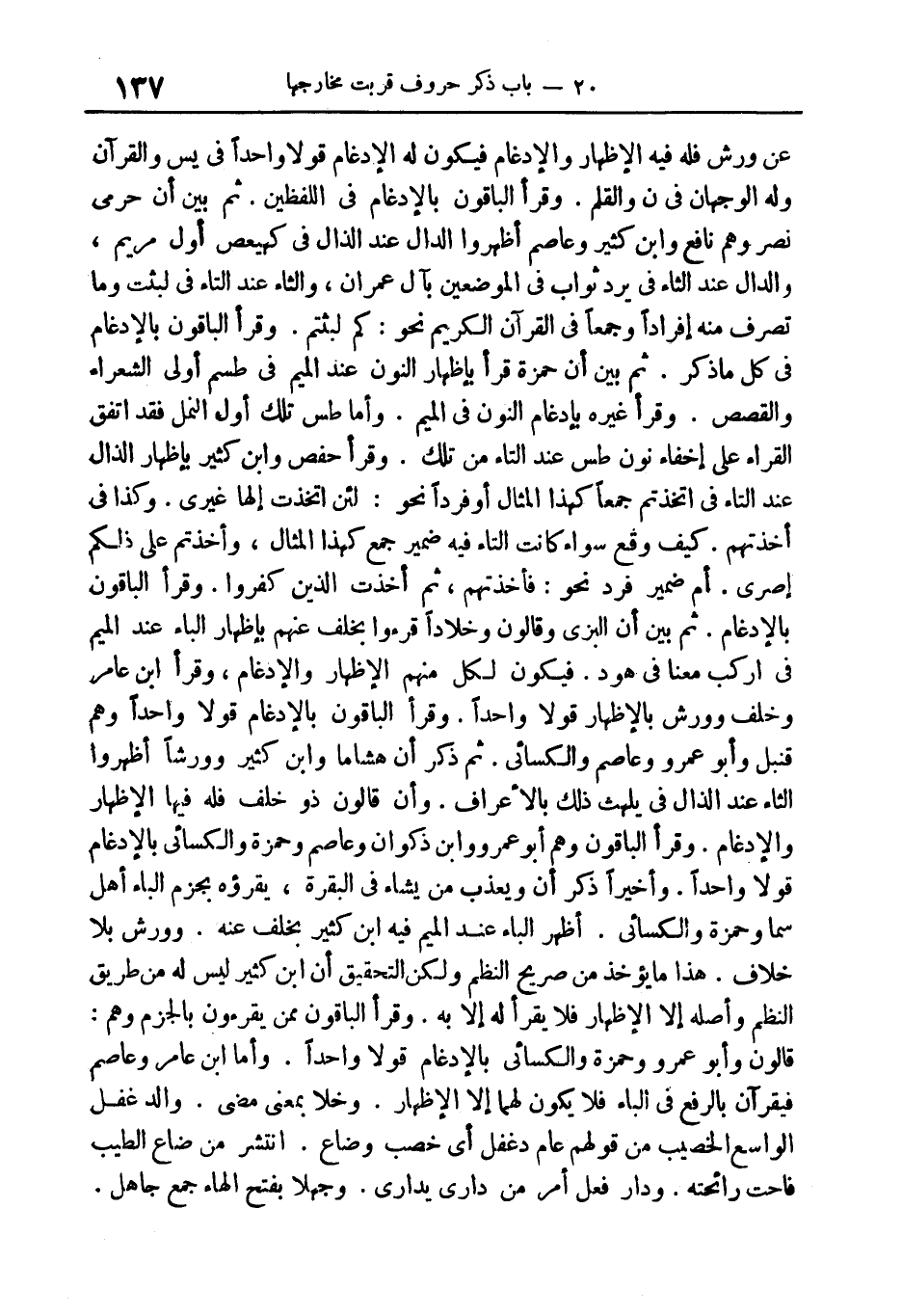 الباقون بالإدغام في كل ما ذكر. ثم بين أن حمزة قرأ بإظهار النون عند الميم في طسم* أولى الشعراء والقصص. وقرأ غيره بإدغام النون في الميم. وأما طس تِلْكَ أول النمل فقد اتفق القراء على إخفاء نون طس عند التاء من تِلْكَ. وقرأ حفص وابن كثير بإظهار الذال عند التاء في اتَّخَذْتُمُ* جمعا كهذا المثال أو فردا نحو: لَئِنِ اتَّخَذْتَ إِلهَاً غَيْرِي.