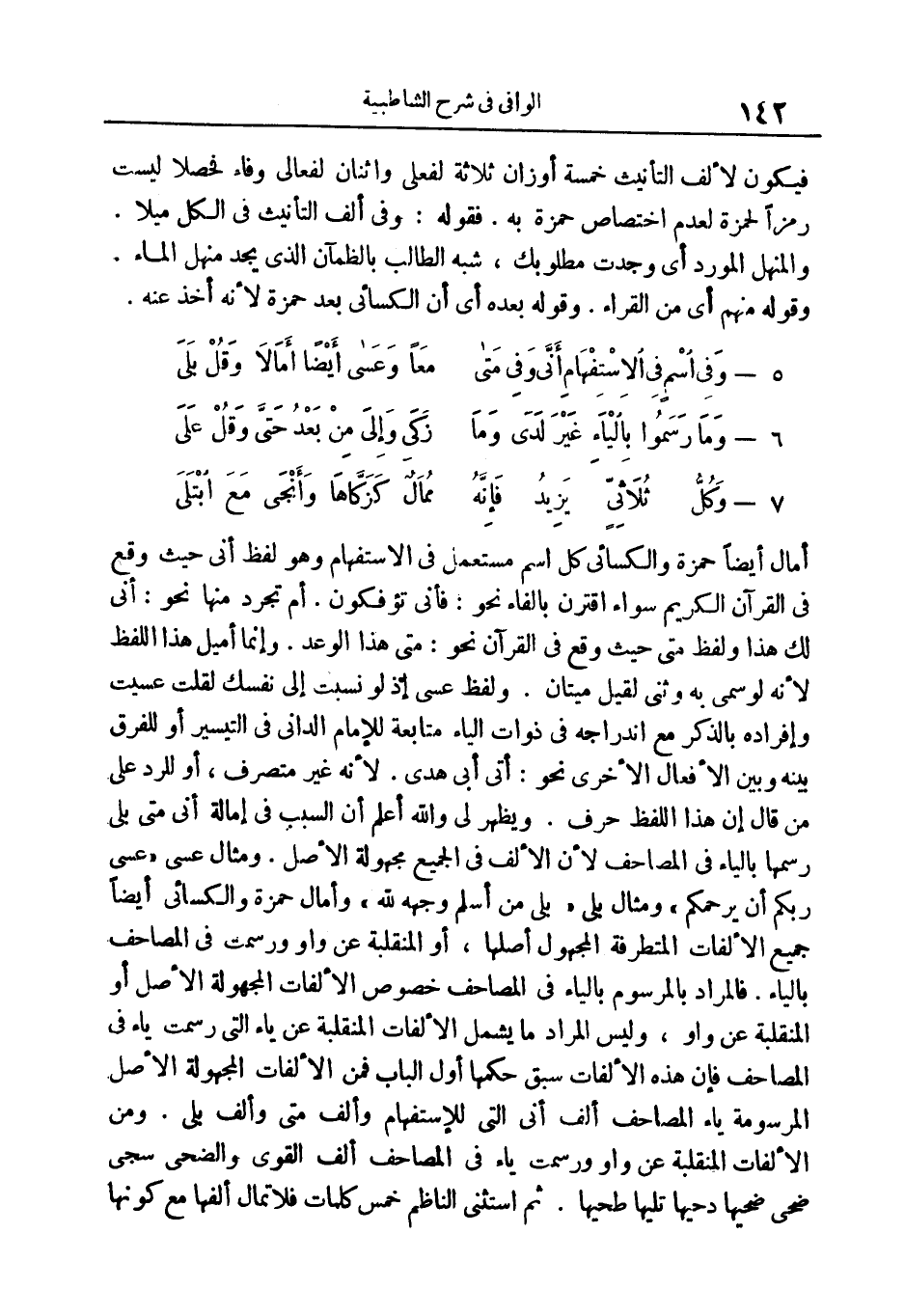 ومن الألفات المنقلبة عن واو ورسمت ياء في المصاحف: ألف الْقَوِيُّ* وَالضُّحى سَجى ضُحًى* ضُحاها* دَحاها تَلاها طَحاها. ثم استثنى الناظم خمس كلمات فلا تمال ألفها مع كونها