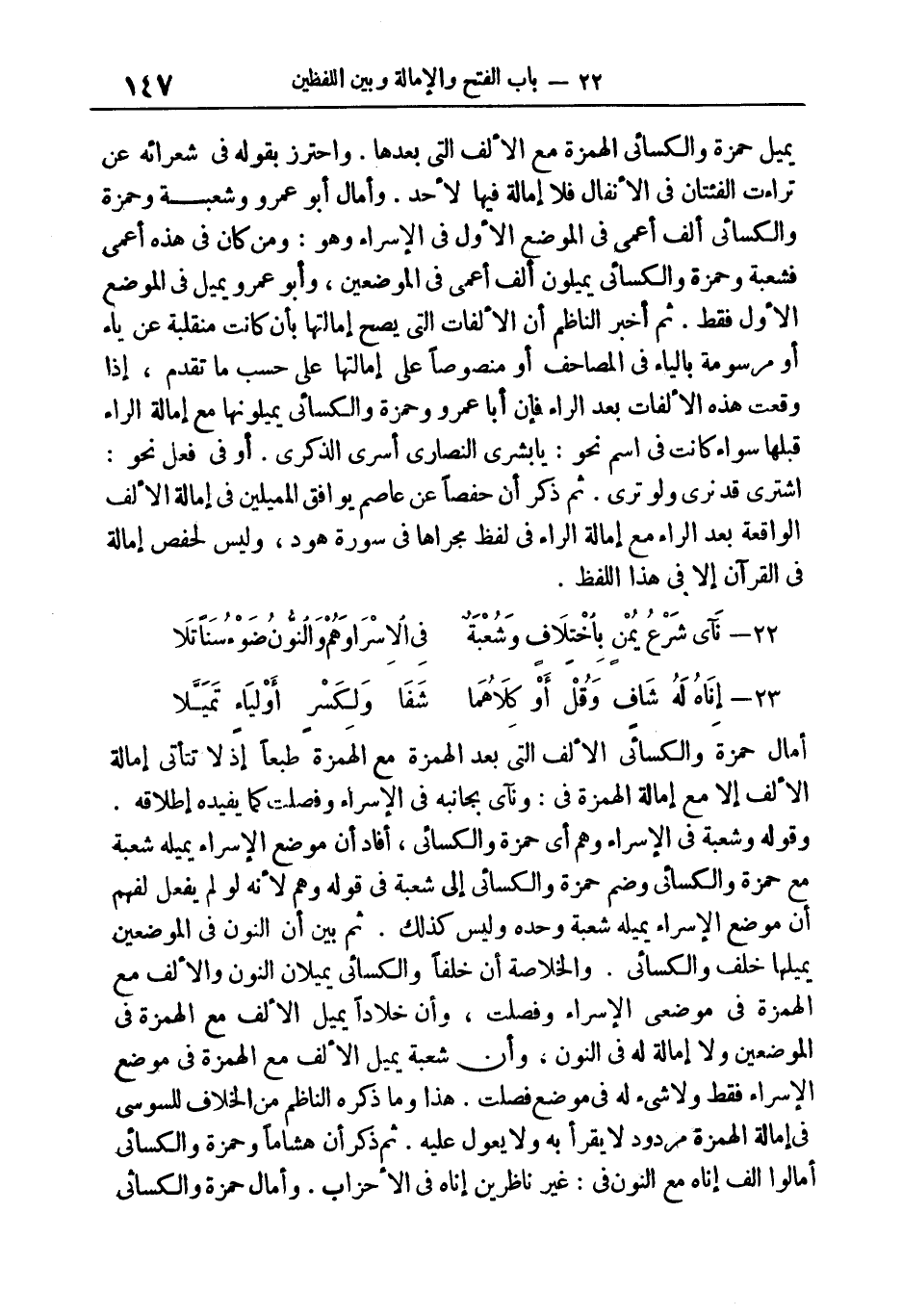 والخلاصة: أن خلفا والكسائي يميلان النون والألف مع الهمزة في موضعي الإسراء وفصلت، وأن خلادا يميل الألف مع الهمزة في الموضعين ولا إمالة له في النون، وأن شعبة يميل الألف مع الهمزة في موضع الإسراء فقط ولا شيء له في موضع فصلت. هذا وما ذكره الناظم من الخلاف للسوسي في إمالة الهمزة مردود لا يقرأ به ولا يعول عليه. ثم ذكر أن هشاما وحمزة والكسائي أمالوا ألف إِناهُ مع النون في: غَيْرَ ناظِرِينَ إِناهُ في الأحزاب.