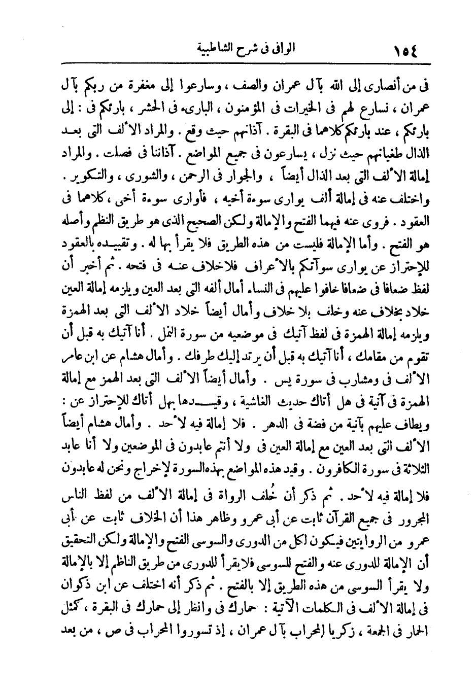 في هل أتاك حديث الغاشية، وقيدها بهل أتاك للاحتراز عن: وَيُطافُ عَلَيْهِمْ بِآنِيَةٍ مِنْ فِضَّةٍ في الدهر. فلا إمالة لأحد. وأمال هشام أيضا الألف التي بعد العين مع إمالة العين في وَلا أَنْتُمْ عابِدُونَ* في الموضعين وَلا أَنا عابِدٌ الثلاثة في سورة الكافرين. وقيد هذه المواضع بهذه السورة لإخراج وَنَحْنُ لَهُ عابِدُونَ فلا إمالة فيه لأحد. ثم ذكر أن خلف الرواة في إمالة الألف من لفظ النَّاسِ* المجرور في جميع القرآن ثابت عن أبي عمرو وظاهر هذا أن الخلاف ثابت عن أبي عمرو من الروايتين فيكون لكل من الدورى والسوسى الفتح والإمالة ولكن التحقيق أن الإمالة للدورى عنه والفتح للسوسى فلا يقرأ للدورى من طريق الناظم إلا بالإمالة ولا يقرأ السوسى من هذه الطريق إلا بالفتح. ثم ذكر أنه عن ابن ذكوان في إمالة الألف في الكلمات الآتية: حِمارِكَ في وَانْظُرْ إِلى حِمارِكَ في البقرة، كَمَثَلِ الْحِمارِ في الجمعة، زَكَرِيَّا الْمِحْرابَ بآل عمران، إِذْ تَسَوَّرُوا الْمِحْرابَ في ص، مِنْ بَعْدِ