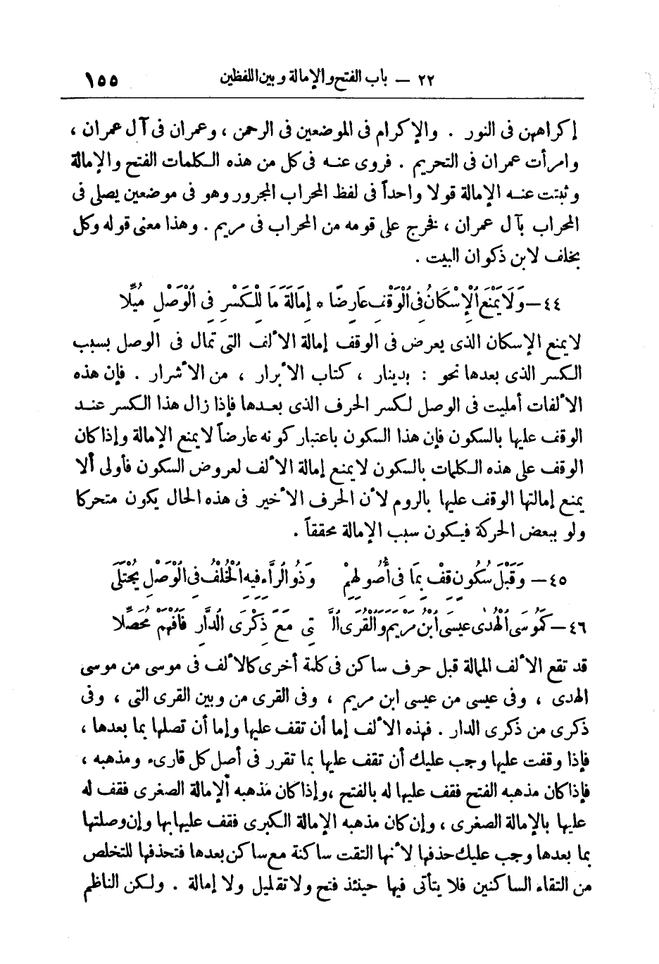 المعنى: قد تقع الألف الممالة قبل حرف ساكن في كلمة أخرى كالألف في مُوسَى من مُوسَى الْهُدى، وفي عيسى من عِيسَى ابْنَ مَرْيَمَ*، وفي الْقُرَى من وَبَيْنَ الْقُرَى الَّتِي، وفي ذِكْرَى من ذِكْرَى الدَّارِ. فهذه الألف إما أن تقف عليها وإما أن تصلها بما بعدها، فإذا وقفت عليها وجب عليك أن تقف عليها بما تقرر في أصل كل