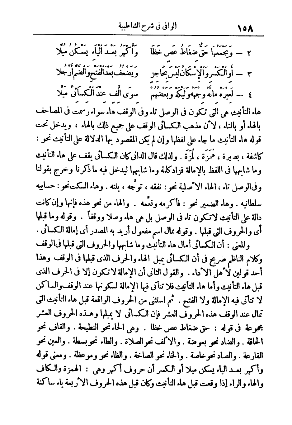 أحد قولين لأهل الأداء. والقول الثاني: أن الإمالة لا تكون إلا في الحرف الذي قبل هاء التأنيث، وأما هاء التأنيث فلا تتأتى فيها الإمالة لسكونها عند الوقف الساكن لا تتأتى فيه الإمالة ولا الفتح. ثم استثنى من الحروف الواقعة قبل هاء التأنيث التي تمال عند الوقف هذه الحروف العشر فإن الكسائي لا يميلها وهذه الحروف العشر مجموعة في قوله: (حق ضغاط عص خظا). وهي الحاء نحو وَالنَّطِيحَةُ. والقاف نحو الْحَاقَّةُ*. والضاد نحو بَعُوضَةً. والألف نحو الصَّلاةِ*. والطاء نحو بَسْطَةً*. والعين نحو الْقارِعَةُ*. والصاد نحو خَاصَّةً. الخاء نحو الصَّاخَّةُ: والظاء نحو وَمَوْعِظَةً*. ومعنى قوله (وأكهر بعد الياء يسكن ميلا) أو الكسر أن حروف (أكهر) وهي: الهمزة والكاف والهاء والراء إذا وقعت قبل هاء التأنيث وكان قبل هذه الحروف الأربعة ياء ساكنة