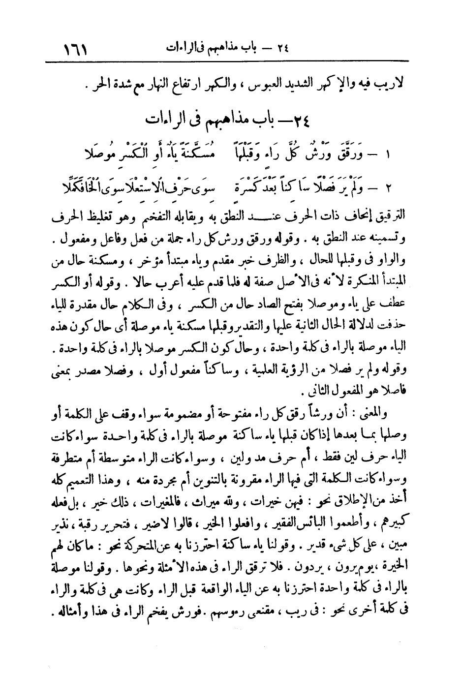 اللغة: الترقيق إنحاف ذات الحرف عند النطق به ويقابله التفخيم وهو تغليظ الحرف وتسمينه عند النطق به وقوله: (ورقق ورش كل راء) جملة من فعل وفاعل ومفعول والواو في و (قبلها) للحال، والظرف خبر مقدم و (ياء) مبتدأ مؤخر، و (مسكنة) حال من المبتدأ النكرة؛ لأنه في الأصل صفة له فلما قدم عليه أعرب حالا. وقوله (أو الكسر) عطف على (ياء) و (موصلا) بفتح الصاد حال من الكسر، وفي الكلام حال مقدرة للياء حذفت لدلالة الحال الثانية عليها، والتقدير: وقبلها مسكنة ياء موصلة؛ أى حال كون هذه الياء موصلة بالراء في كلمة واحدة، وحال كون الكسر موصلا بالراء في كلمة واحدة. وقوله (ولم ير فصلا) من الرؤية العلمية، و (ساكنا) مفعول أول، و (فصلا) مصدر بمعنى فاصلا هو المفعول الثاني.