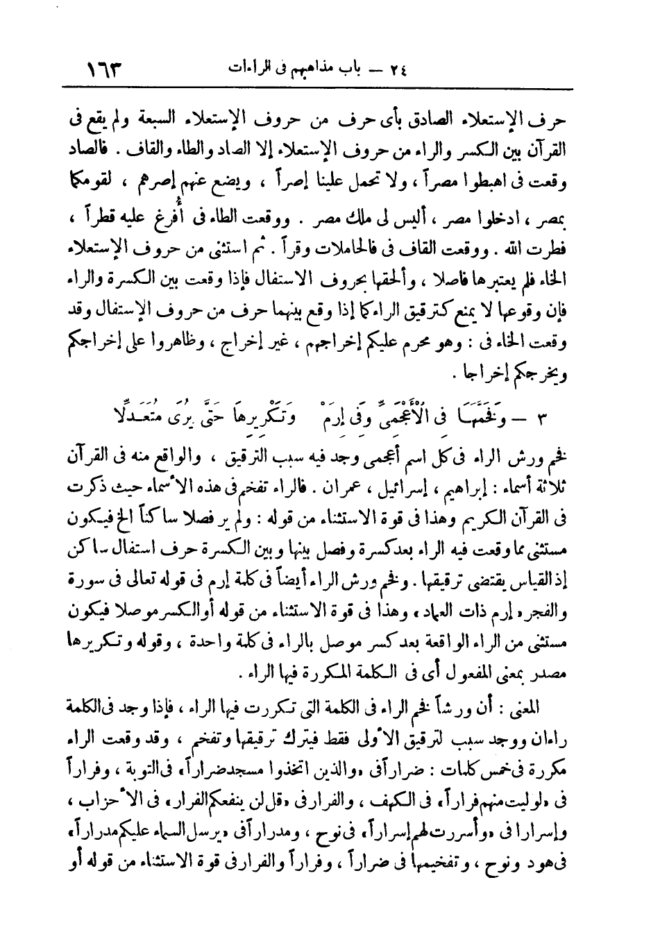 اللغة: فخّم ورش الراء في كل اسم أعجمي وجد فيه سبب الترقيق، والواقع منه في القرآن ثلاثة أسماء: إِبْراهِيمَ*، إِسْرائِيلَ*، عِمْرانَ*. فالراء تفخم في هذه الأسماء حيث ذكرت في القرآن الكريم وهذا في قوة الاستثناء من قوله: (ولم ير فصلا ساكنا ... إلخ) فيكون مستثنى مما وقعت فيه الراء بعد كسرة وفصل بينها وبين الكسرة حرف استفال ساكن إذ القياس يقتضي ترقيقها.