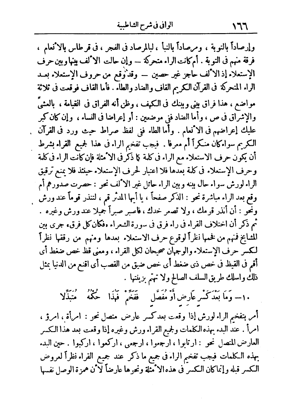 وَإِرْصاداً بالتوبة، ومِرْصاداً بالنبإ، لَبِالْمِرْصادِ في الفجر فِي قِرْطاسٍ بالأنعام، فِرْقَةٍ مِنْهُمْ في التوبة. أم كانت الراء متحركة- وإن حالت الألف بينها وبين حرف الاستعلاء إذ الألف حاجز غير حصين- وقد وقع من حروف الاستعلاء بعد الراء المتحركة في القرآن الكريم: القاف والضاد والطاء. فأما القاف فوقعت في ثلاثة مواضع، هذا فِراقُ بَيْنِي وَبَيْنِكَ في الكهف، وَظَنَّ أَنَّهُ الْفِراقُ في القيامة، بِالْعَشِيِّ وَالْإِشْراقِ في ص، وأما الضاد ففي موضعين: أَوْ إِعْراضاً في النساء، وَإِنْ كانَ كَبُرَ عَلَيْكَ إِعْراضُهُمْ في الأنعام. وأما الطاء ففي لفظ صِراطَ* حيث ورد في القرآن الكريم سواء كان منكرا أم معرفا. فيجب