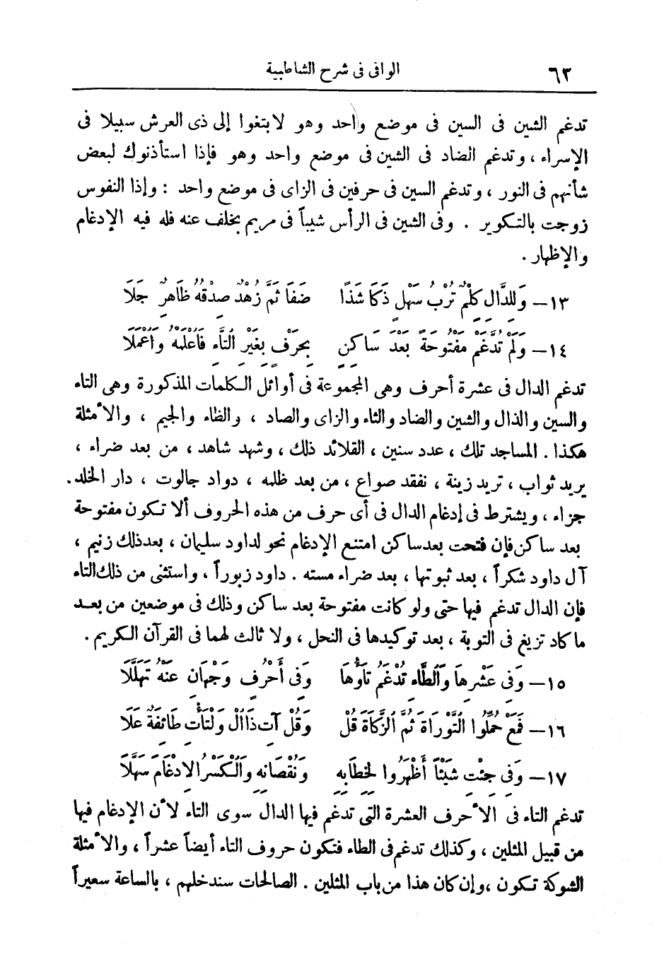المعنى: تدغم الدال في عشرة أحرف وهي المجموعة في أوائل الكلمات المذكورة وهي التاء، والسين، والذال، والشين، والضاد، والثاء، والزاي، والصاد، والظاء، والجيم، والأمثلة هكذا. الْمَساجِدِ تِلْكَ، عَدَدَ سِنِينَ، وَالْقَلائِدَ ذلِكَ، وَشَهِدَ شاهِدٌ*، مِنْ بَعْدِ ضَرَّاءَ* مَنْ كانَ يُرِيدُ ثَوابَ، تُرِيدُ زِينَةَ، نَفْقِدُ صُواعَ، مِنْ بَعْدِ ظُلْمِهِ، داوُدُ جالُوتَ، دارُ الْخُلْدِ جَزاءً، ويشترط في إدغام الدال في أي حرف من هذه الحروف ألا تكون مفتوحة بعد ساكن، فإن فتحت بعد ساكن امتنع الإدغام نحو لِداوُدَ سُلَيْمانَ، بَعْدَ ذلِكَ زَنِيمٍ، آلَ داوُدَ شُكْراً، بَعْدَ ثُبُوتِها بَعْدَ ضَرَّاءَ مَسَّتْهُ* داوُدَ زَبُوراً*، واستثنى من ذلك التاء، فإن الدال تدغم فيها حتى ولو كانت مفتوحة بعد ساكن وذلك في موضعين مِنْ بَعْدِ ما كادَ يَزِيغُ في التوبة، بَعْدَ تَوْكِيدِها في النحل، ولا ثالث لهما في القرآن الكريم.
