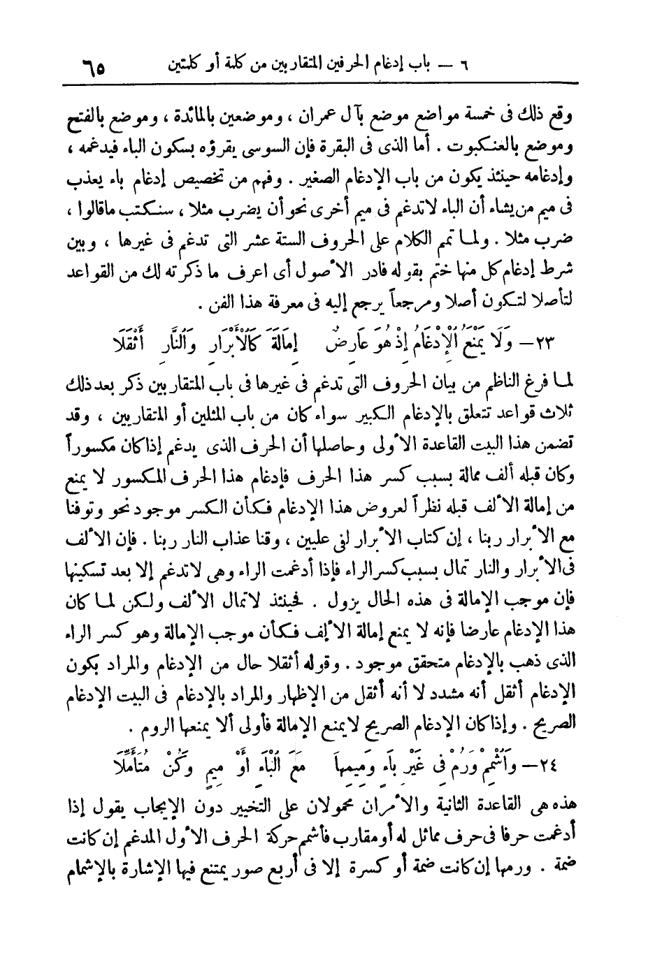 المعنى: لما فرغ الناظم من بيان الحروف التي تدغم في غيرها في باب المتقاربين، ذكر بعد ذلك ثلاث قواعد تتعلق بالإدغام الكبير، سواء كان من باب المثلين أو المتقاربين، وقد تضمن هذا البيت القاعدة الأولى، وحاصلها: أن الحرف الذي يدغم إذا كان مكسورا وكان قبله ألف ممالة بسبب كسر هذا الحرف، فإدغام هذا الحرف المكسور لا يمنع من إمالة الألف قبله نظرا لعروض هذا الإدغام، فكأن الكسر موجود نحو: وَتَوَفَّنا مَعَ الْأَبْرارِ (193) رَبَّنا، إِنَّ كِتابَ الْأَبْرارِ لَفِي عِلِّيِّينَ، فَقِنا عَذابَ النَّارِ (191) رَبَّنا. فإن الألف في الْأَبْرارِ* والنَّارَ* تمال بسبب كسر الراء فإذا أدغمت الراء وهي لا تدغم إلا بعد تسكينها، فإن موجب الإمالة في هذه الحال يزول. فحينئذ لا تمال الألف ولكن لما كان هذا الإدغام عارضا؛ فإنه لا يمنع إمالة الألف فكأن موجب الإمالة وهو كسر الراء الذي ذهب بالإدغام متحقق موجود. وقوله: (أثقلا): حال من الإدغام، والمراد بكون الإدغام أثقل أنه مشدد لا أنه أثقل من الإظهار، والمراد بالإدغام في البيت الإدغام الصريح. وإذا كان الإدغام الصريح لا يمنع الإمالة فأولى ألا يمنعها الرّوم.