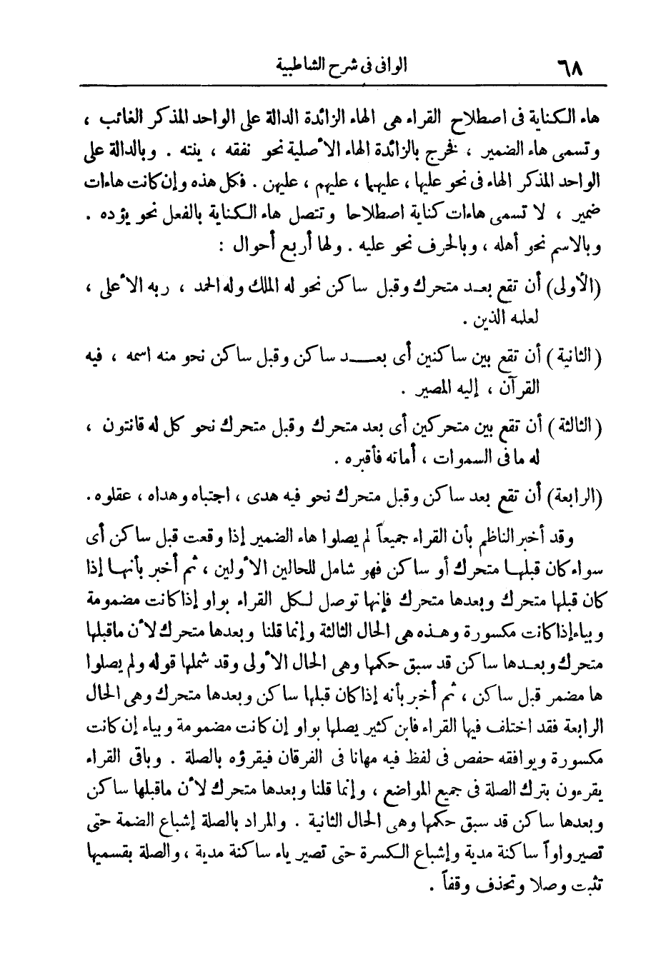 وقد أخبر الناظم بأن القراء جميعا لم يصلوا هاء الضمير إذا وقعت قبل ساكن أي سواء كان قبلها متحرك أو ساكن، فهو شامل للحالين الأولين، ثم أخبر بأنها إذا كان قبلها متحرك وبعدها متحرك؛ فإنها توصل لكل القراء بواو إذا كانت مضمومة، وبياء إذا كانت مكسورة وهذه هي الحال الثالثة وإنما قلنا: وبعدها متحرك؛ لأن ما قبلها متحرك وبعدها ساكن قد سبق حكمها وهي الحال الأولى وقد شملها قوله: ولم يصلوا ها مضمر قبل ساكن، ثم أخبر بأنه إذا كان قبلها ساكن وبعدها متحرك وهي الحال الرابعة، فقد اختلف فيها القراء؛ فابن كثير يصلها بواو إن كانت مضمومة، وبياء إن كانت مكسورة، ويوافقه حفص في لفظ فِيهِ مُهاناً في الفرقان؛ فيقرؤه بالصلة. وباقي القراء يقرءون بترك الصلة في جميع المواضع، وإنما قلنا: وبعدها متحرك؛ لأن ما قبلها ساكن وبعدها ساكن قد سبق حكمها وهي الحال الثانية. والمراد بالصلة: إشباع الضمة حتى تصير واوا ساكنة مدية وإشباع الكسرة حتى تصير ياء ساكنة مدية، والصلة بقسميها تثبت وصلا وتحذف وقفا.