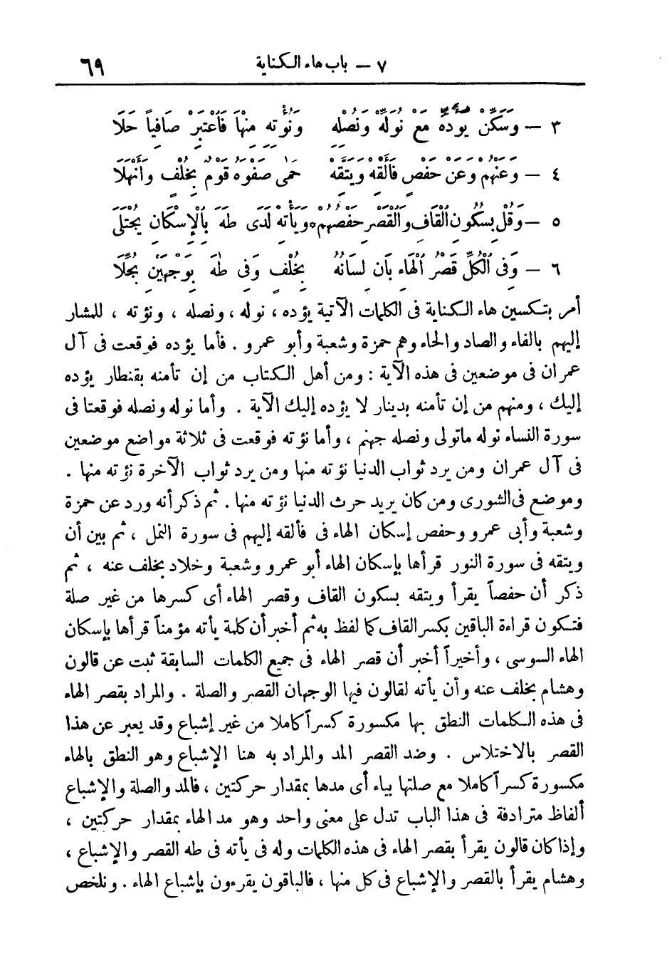 كسرها من غير صلة فتكون قراءة الباقين بكسر القاف كما لفظ به، ثم أخبر أن كلمة يَأْتِهِ مُؤْمِناً قرأها بإسكان الهاء السوسي، وأخيرا أخبر أن قصر الهاء في جميع الكلمات السابقة ثبت عن قالون، وهشام بخلف عنه، وأن (يأته) لقالون فيها الوجهان: القصر والصلة، والمراد بقصر الهاء في هذه الكلمات: النطق بها مكسورة كسرا كاملا من غير إشباع وقد يعبر عن هذا القصر الاختلاس. وضد القصر المد، والمراد به هنا الإشباع، وهو النطق بالهاء مكسورة كسرا كاملا مع صلتها بياء؛ أي مدها بمقدار حركتين، فالمد والصلة والإشباع ألفاظ مترادفة في هذا الباب تدل على معنى واحد؛ وهو مد الهاء بمقدار حركتين، وإذا كان قالون يقرأ بقصر الهاء في هذه الكلمات وله في يَأْتِهِ في طه القصر والإشباع، وهشام يقرأ بالقصر والإشباع في كل منها، فالباقون يقرءون بإشباع الهاء. ونلخص
