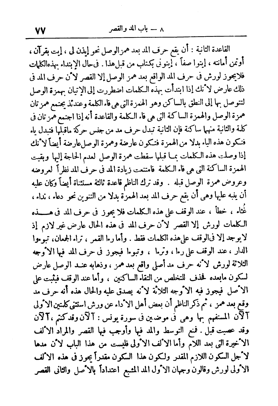 والقاعدة: أنه إذا اجتمع همزتان في كلمة والثانية منهما ساكنة؛ فإن الثانية تبدل حرف مد من جنس حركة ما قبلها، فتبدل ياء فتكون هذه الياء بدلا من الهمزة فتكون عارضة وهمزة الوصل عارضة أيضا؛ لأنك إذا وصلت هذه الكلمات بما قبلها؛ سقطت همزة الوصل لعدم الحاجة إليها وبقيت الهمزة الساكنة التي هي فاء الكلمة، فامتنعت زيادة المد في حرف المد نظرا لعروضه، وعروض همزة الوصل قبله. وقد ترك الناظم قاعدة ثالثة مستثناة أيضا، وكان عليه أن ينبه عليها وهي: أن يقع حرف المد بعد الهمزة بدلا من التنوين نحو دُعاءً*، نِداءً* غُثاءً*، خَطَأً*، عند الوقف على هذه الكلمات؛ فلا يحوز في حرف المد في هذه الكلمات لورش إلا القصر؛ لأن حرف المد في هذه الحال عارض غير لازم، إذ لا يوجد إلا في الوقف على هذه الكلمات فقط. وأما رَأَى الْقَمَرَ، تَراءَا الْجَمْعانِ، تَبَوَّؤُا الدَّارَ، عند الوقف على رَأى *، وتَراءَا، وتَبَوَّؤُا فيجوز في حرف المد فيها الأوجه الثلاثة لورش؛ لأنه حرف مد أصلي واقع بعد همز، وذهابه عند الوصل عارض لسكون ما بعده، فحذف للتخلص من التقاء الساكنين، وأما عند الوقف؛ فيثبت على الأصل، فيجوز فيه الأوجه الثلاثة؛ لأنه يصدق عليه، والحال هذه أنه حرف مد وقع بعد همز.