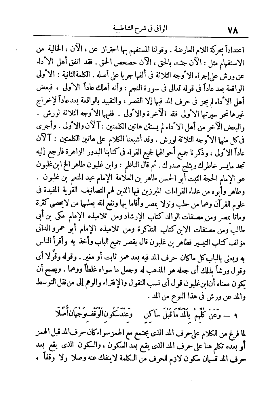 وَأَنَّهُ أَهْلَكَ عاداً الْأُولى، فبعض أهل الأداء لم يجز في حرف المد فيها إلا القصر، والتقييد بالواقعة بعد عاداً* لإخراج غيرها نحو سِيرَتَهَا الْأُولى فَلِلَّهِ الْآخِرَةُ وَالْأُولى. ففيهما الأوجه الثلاثة لورش. والبعض الآخر من أهل الأداء لم يستثن هاتين الكلمتين: آلْآنَ* وَالْأُولى * وأجرى في كل منهما الأوجه الثلاثة لورش.