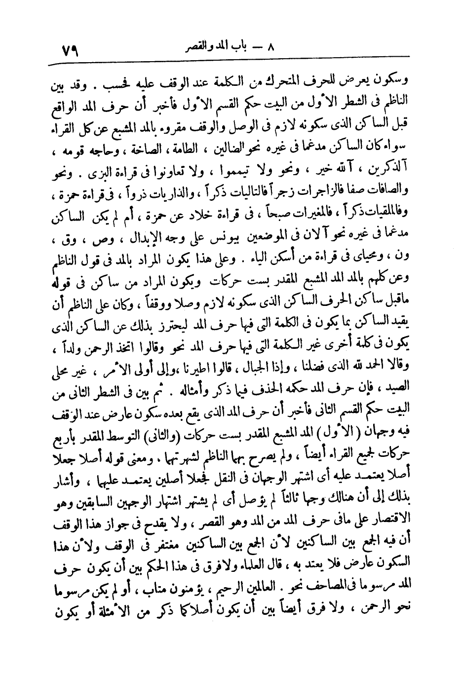 قراءة خلاد عن حمزة، أم لم يكن الساكن مدغما في غيره نحو آلْآنَ* في الموضعين بيونس على وجه الإبدال، وص، وق، ون، وَمَحْيايَ في قراءة من أسكن الياء. وعلى هذا يكون المراد بالمد في قوله الناظم: وعن كلهم بالمد، المد المشبع المقدر بستّ حركات، ويكون المراد من ساكن في قوله: ما قبل ساكن؛ الحرف الساكن الذي سكونه لازم وصلا ووقفا، وكان على الناظم أن يقيد الساكن بما يكون في الكلمة التي فيها حرف المد ليحترز بذلك عن الساكن الذي يكون في كلمة أخرى غير الكلمة التي فيها حرف المد نحو وَقالُوا اتَّخَذَ الرَّحْمنُ وَلَداً* وَقالا الْحَمْدُ لِلَّهِ الَّذِي فَضَّلَنا، وَإِذَا الْجِبالُ*، قالُوا اطَّيَّرْنا، وَإِلى أُولِي الْأَمْرِ، غَيْرَ مُحِلِّي الصَّيْدِ، فإن حرف المد حكمه الحذف فيما ذكر وأمثاله. ثم بين في الشطر الثاني من البيت حكم القسم الثاني فأخبر أن حرف المد الذي يقع بعده سكون عارض عند الوقف فيه وجهان: الأول- المد المشبع المقدر بست حركات والثاني- التوسط المقدر بأربع حركات لجميع القراء أيضا، ولم يصرح بهما الناظم لشهرتهما، ومعنى قوله: (أصلا) جعلا أصلا يعتمد عليه أي اشتهر الوجهان في النقل فجعلا أصلين يعتمد عليهما، وأشار بذلك إلى أن هنالك وجها ثالثا لم يؤصل؛ أي لم يشتهر اشتهار الوجهين السابقين وهو الاقتصار على ما في حرف المد من المد وهو القصر، ولا يقدح في جواز هذا الوقف، أن فيه الجمع بين الساكنين؛ لأن الجمع بين الساكنين مغتفر في الوقف ولأن هذا السكون عارض فلا يعتد به، قال العلماء: ولا فرق في هذا الحكم بين أن يكون حرف المد مرسوما في المصاحف نحو الْعالَمِينَ* الرَّحِيمِ* يُؤْمِنُونَ* مَتابِ، أَوَلَمْ يَكُنْ مرسوما نحو الرَّحْمنِ*، ولا فرق أيضا بين أن يكون أصلا كما ذكر من الأمثلة أو يكون