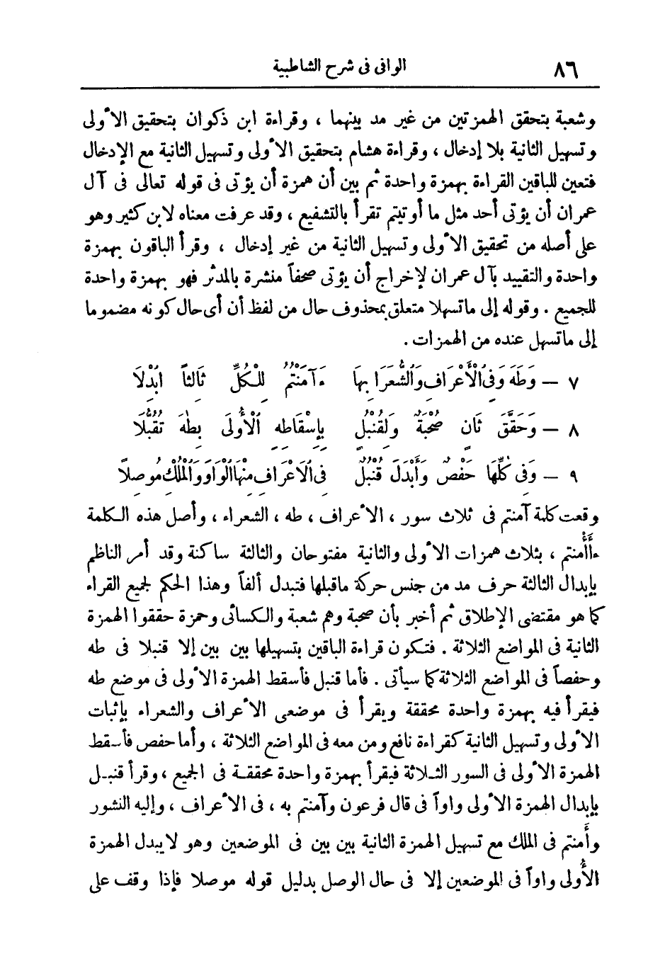 الثلاثة كما سيأتي، فأما قنبل فأسقط الهمزة الأولى في موضع طه فيقرأ فيه بهمزة واحدة محققة ويقرأ في موضعي الأعراف، والشعراء بإثبات الأولى وتسهيل الثانية كقراءة نافع ومن معه في المواضع الثلاثة، وأما حفص: فأسقط الهمزة الأولى في السور الثلاثة، فيقرأ بهمزة واحدة محققة في الجميع، وقرأ قنبل بإبدال الهمزة الأولى واوا في قالَ فِرْعَوْنُ آمَنْتُمْ بِهِ، في الأعراف، وَإِلَيْهِ النُّشُورُ وأَ أَمِنْتُمْ في الملك مع تسهيل الهمزة الثانية بين بين في الموضعين وهو لا يبدل الهمزة الأولى واوا في الموضعين إلا في حال الوصل بدليل قوله: